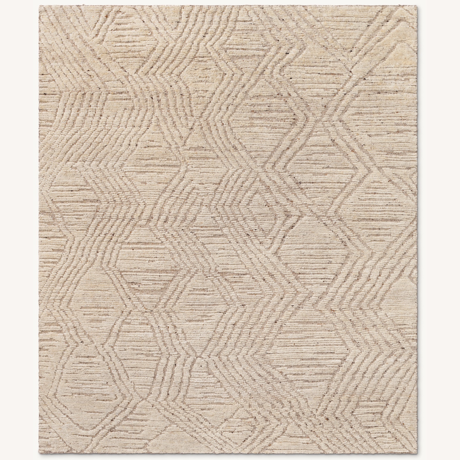 Hand knotted from undyed wool, Halima translates a tribal motif into a modern geometric design with high-low definition. Enhanced by hand spinning, the wool's organic shading is revealed in the nuanced texture of a sheared finish.