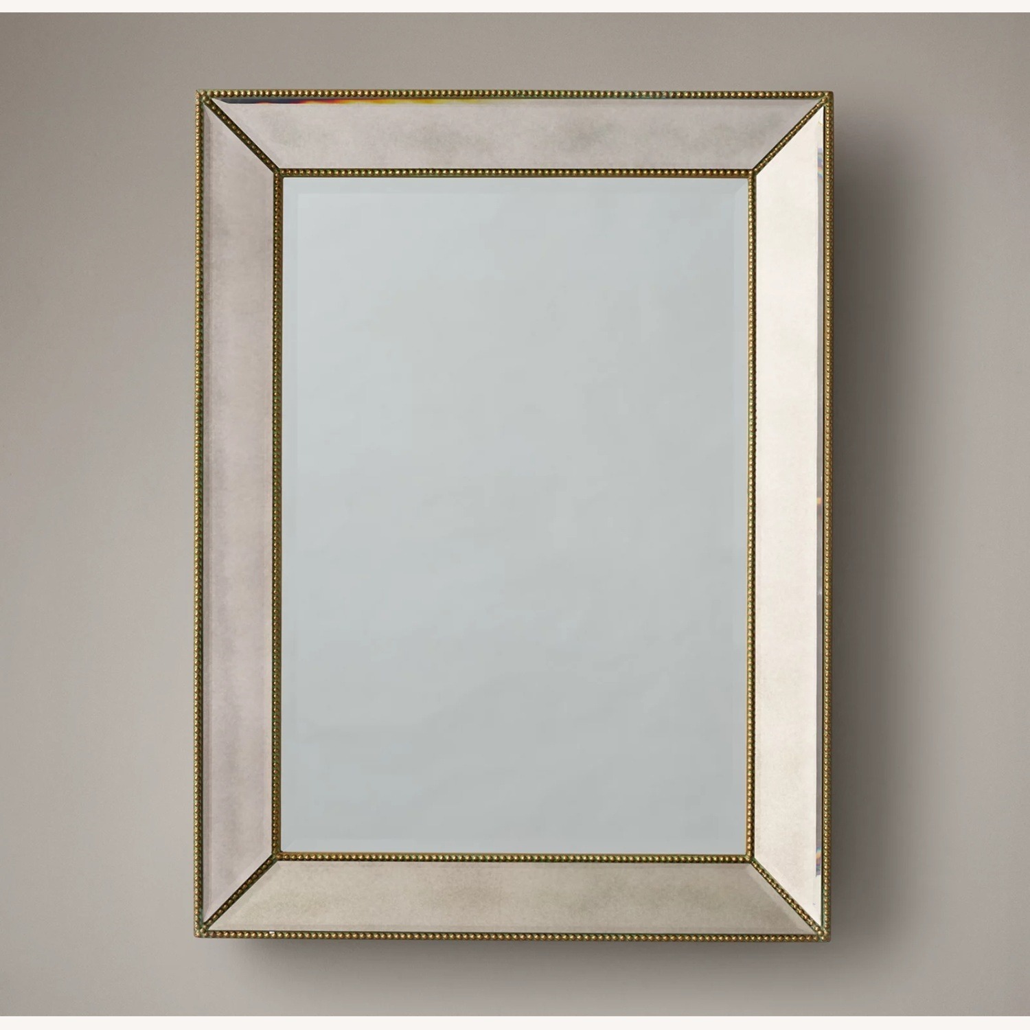 Seller's Notes:Restoration Hardwares Venetian Beaded Mirror. A broad beveled mirror that’s accented with aged brass resin needs. Can hand vertically or horizontally. 30” W x 40” H x 4” D. Weighs 45 pounds. Substantial and elegant looking in real life. Beveled edges have an antique / smokey effect. Does not come with mounting hardware.Details Can hang vertically or horizontally with included hanging hardware Professional installation recommended for mirrors weighing more than 100 lbs., and when mounting on a tile or stone surface.