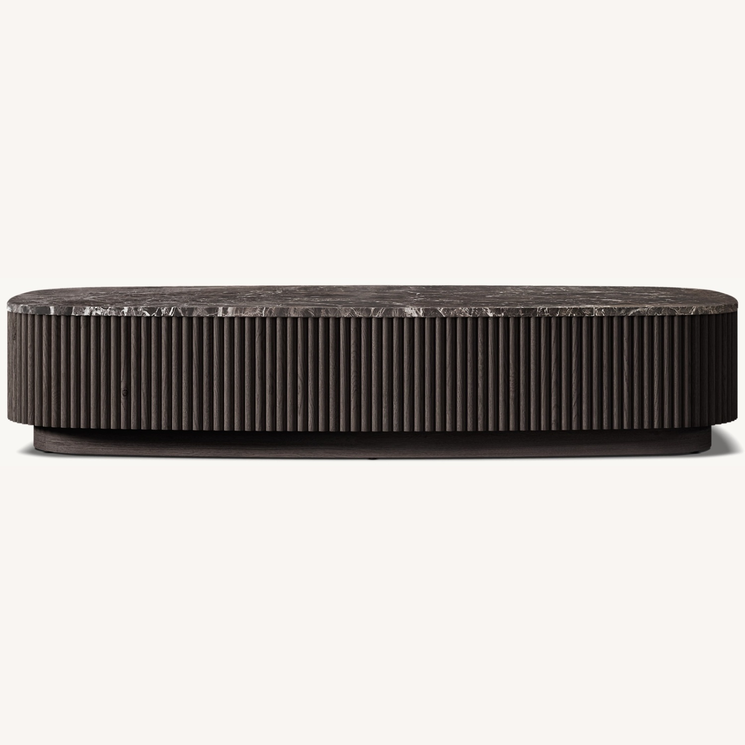 Defined by individually applied reeds of wire-brushed solid American white oak, Mulholland is the creation of celebrated design team Thomas Bina and Ronald Sasson. The collection features radius corners that curve around the side for an uninterrupted, fluid silhouette. Crafted of Emperador marble, the top is replete with rich veining and striking color contrasts that make each piece unique.