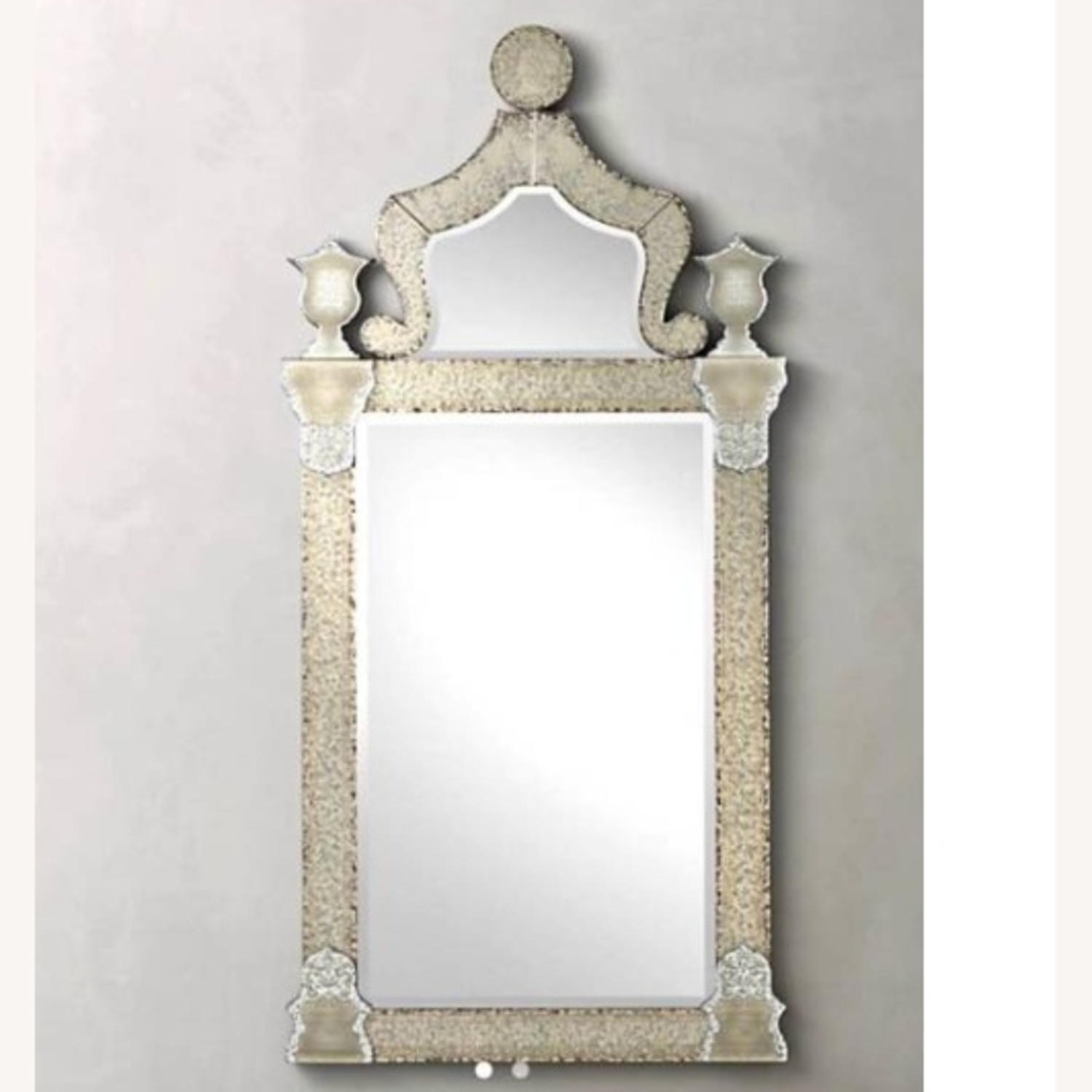 Seller's Notes: This gorgeous mirror has a stunning antique finish. If you are looking for drama you might have just found it. This piece boasts urns shapes a center medallion and lots of detailed etching. In good condition, minimal wear from usage. This is a discounted model.
