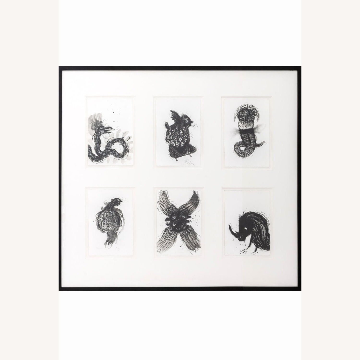 Seller's Notes:Incredible original art from private NYC collection. Robert Danderov (Macedonian/American, b. 1959). Large scale of framing and detail of individual framed plates combine into impactful statement piece. Large scale original art for the collector. Six Mutant Animals, mixed media on paper, each signed in pencil, in ebonized wood frame. Occasional nick and scratch on frame but easily covered. Each image: 11 H x 7.5 W Overall: 36 H x 39 W Frame: 37 H x 39.5 W Surrealist, macabre, Gothic, black and white.