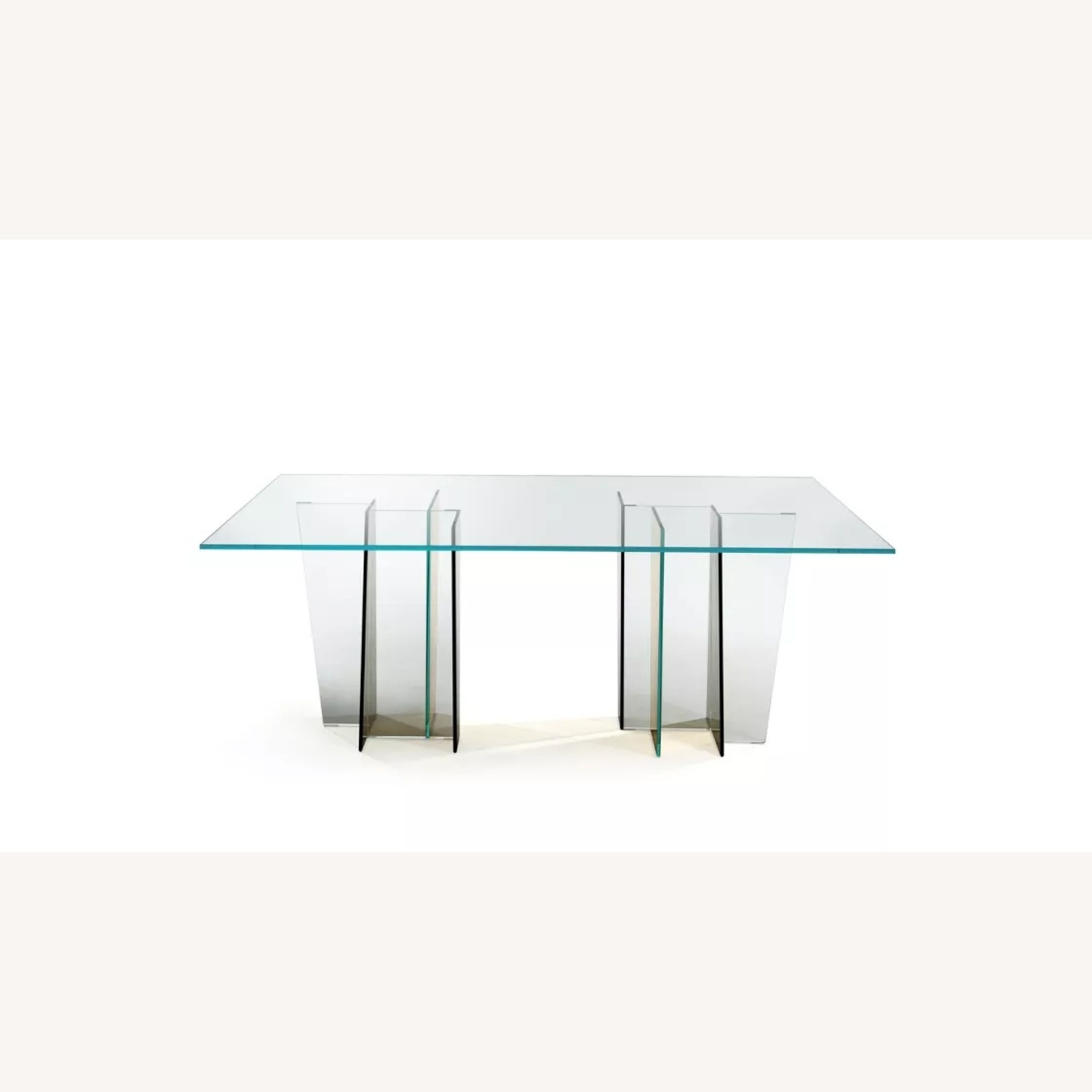 Diapo is an all-glass table designed by René Bouchara. The base features different pieces of glass, some with a slight angle cut, that are glued together to resemble an abstract sculpture. This unique base is perfectly visible under the extra-clear top. Different combinations of colours, reflections and transparencies are available.
