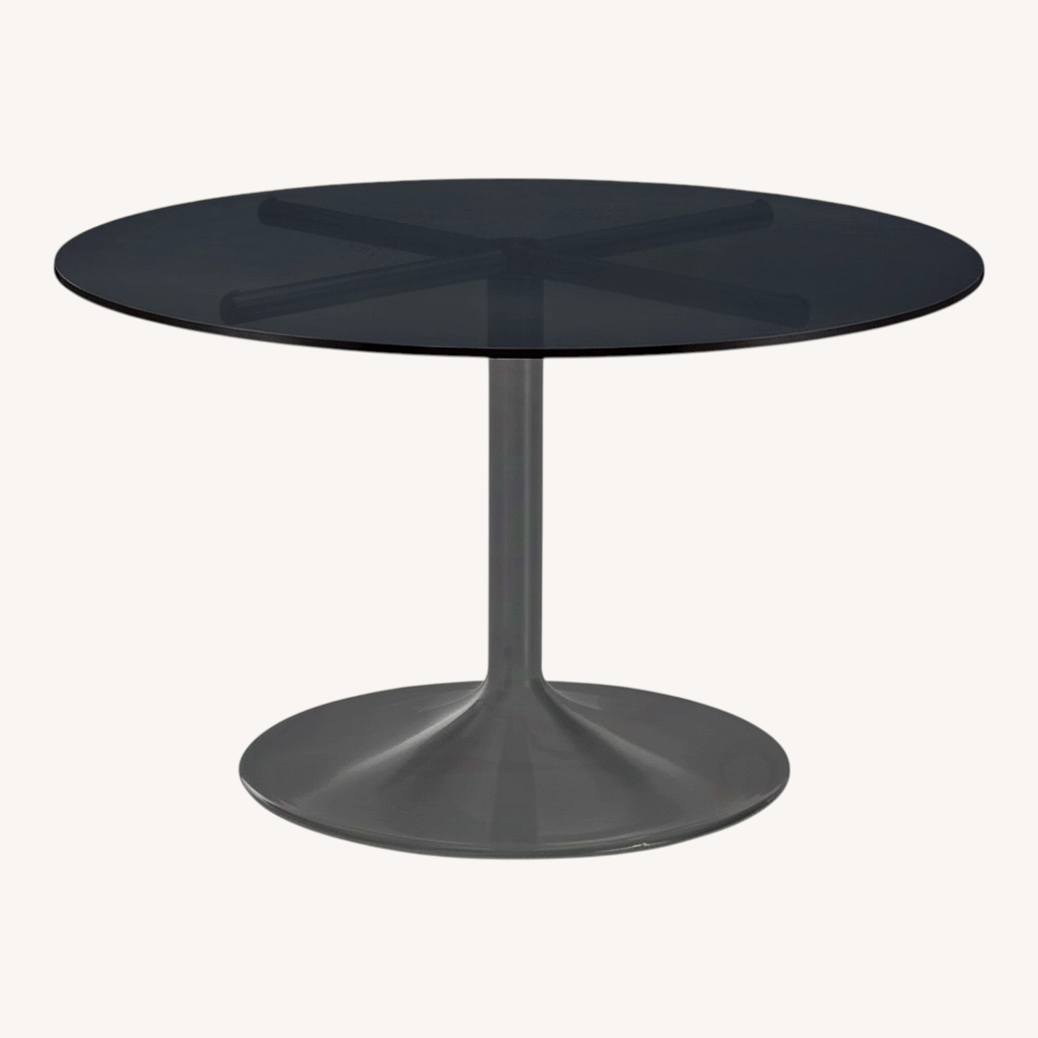 Seller's Notes:Room and Board 36” pedestal table - smoky glass top with graphite metal base. Like new condition. Can fit 4 chairs