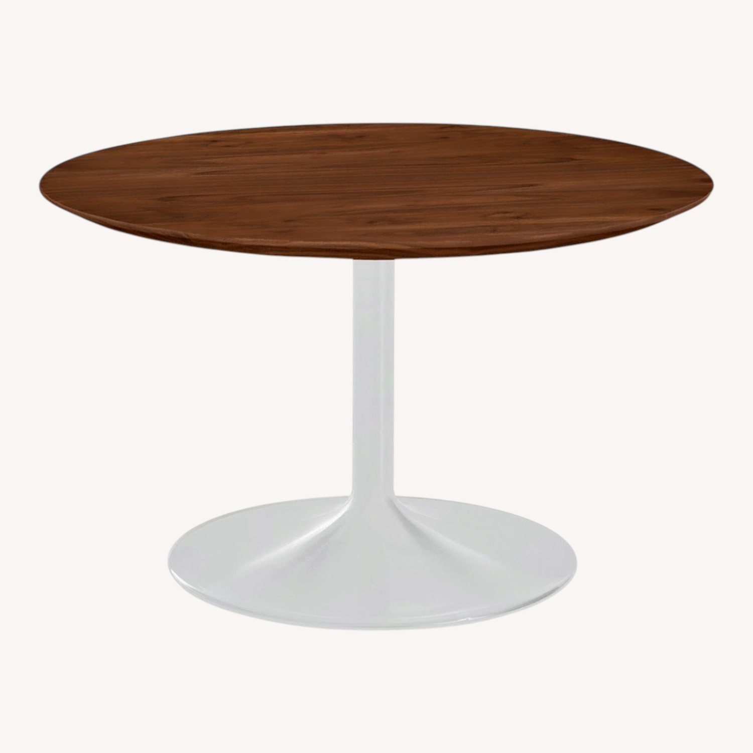 Seller's Notes:We’re selling our gently used Aria 36″ round dining table from Room & Board, featuring a warm walnut wood veneer top and a sleek white powder-coated steel pedestal base.
