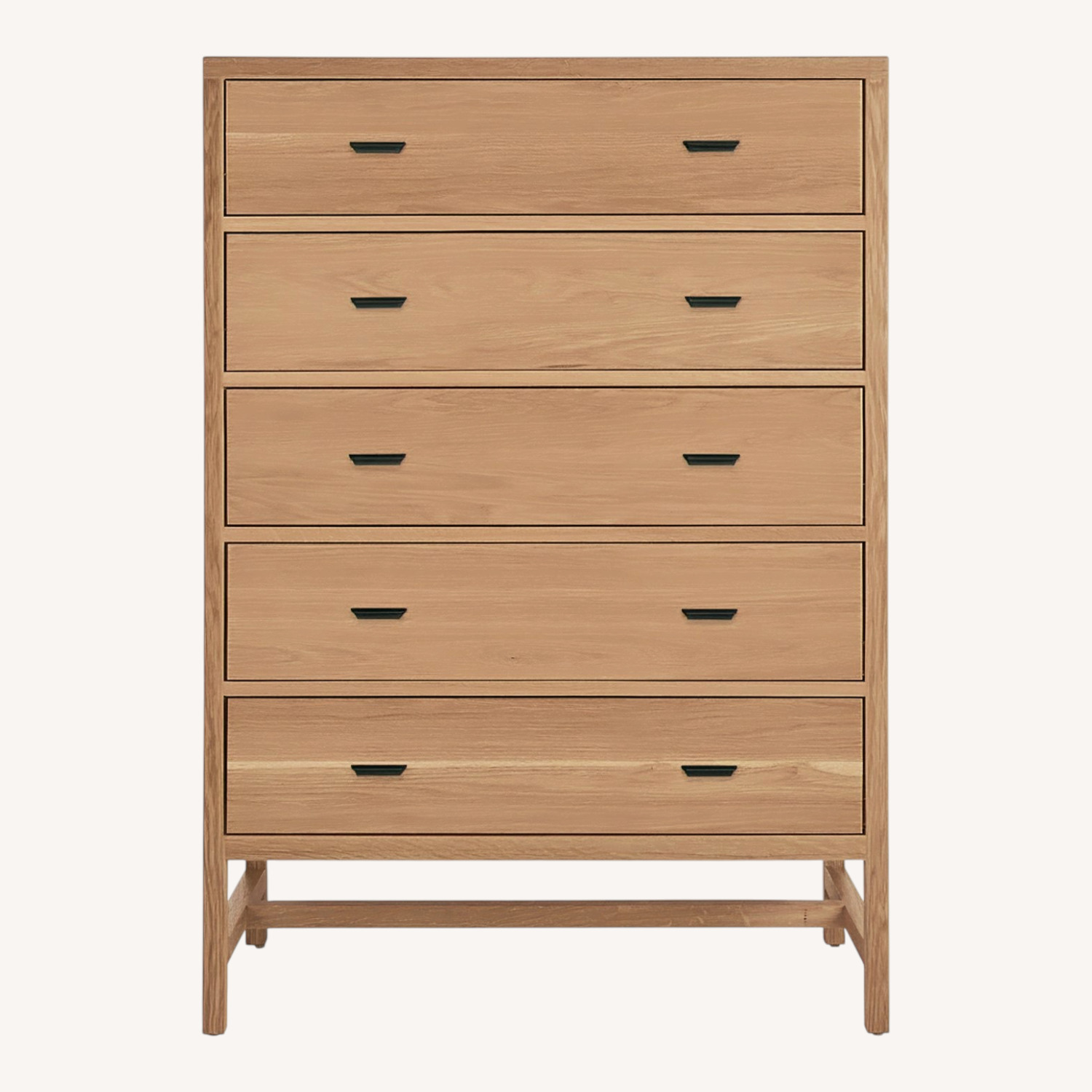 Urban Outfitters Light Brown Bamboo Side TableWest Elm Pippa 5 Drawer White Wood DresserPottery Barn Natural Wood Desk