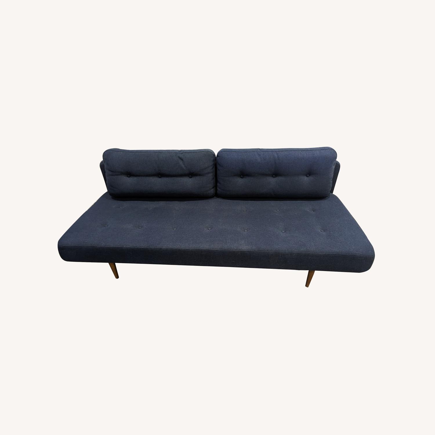 Seller's Notes:Handsome, lightly-used Room & Board Deco sleeper sofa in Ula Ink (Dark Navy) color. Perfect for any mid-century modern living space! Folds into a queen-sized bed-frame within 5-10 seconds, and is light enough to be easily folded by kids or grandparents. Some slight discoloration on the back cushion (that faces the wall) from sun exposure. This cushion should never be visible, though, as it only folds down when the couch is in "bed" form - where it can be covered with sheets.
