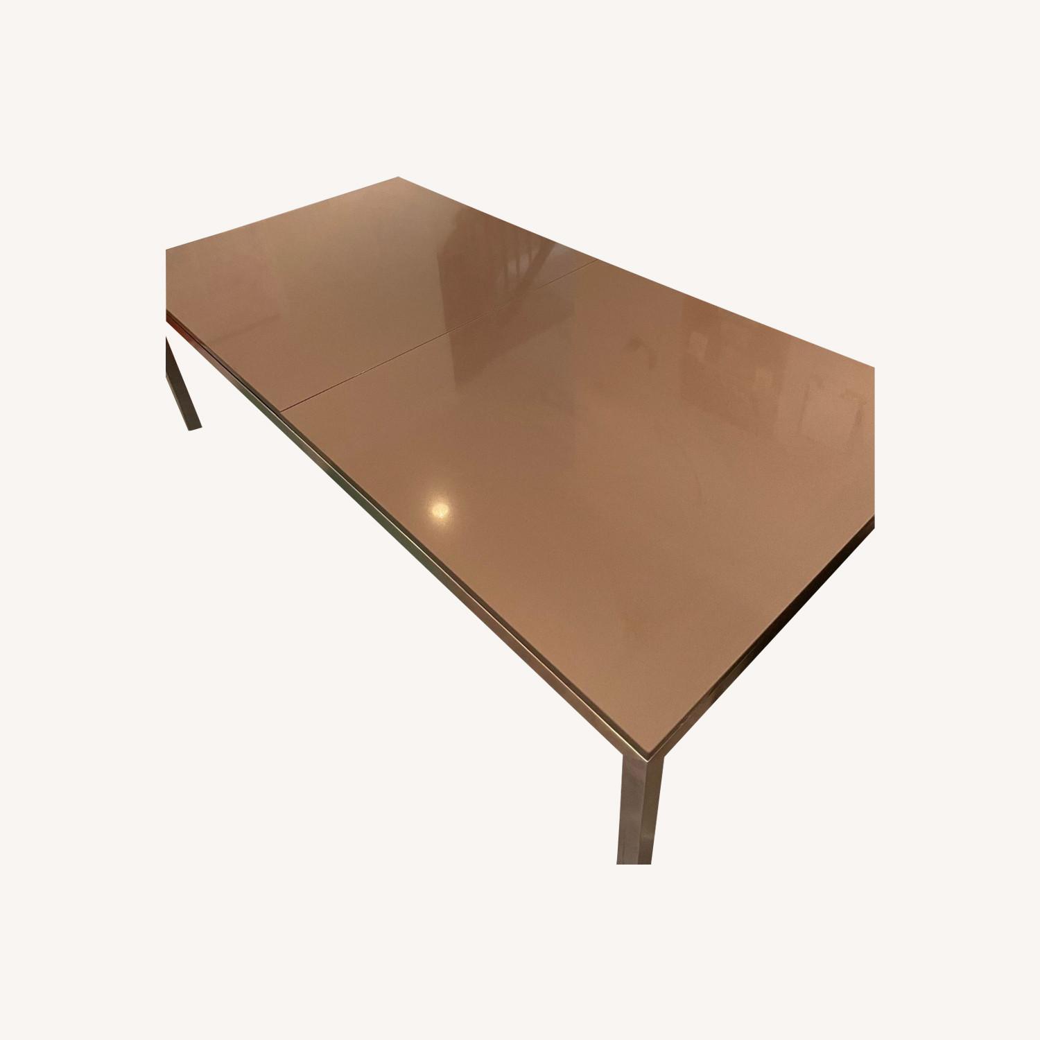 Seller's Notes:Reluctantly selling this Room and Board Parsons table as we are finally purchasing a table that’s a better size for our dining room. Measurements of the table are 72” long, 36” wide and 29” tall. It’s a silver metal base with a gray “fog” quartz top. This table has been absolutely amazing with kids. The stone top is incredibly durable and wipes clean.