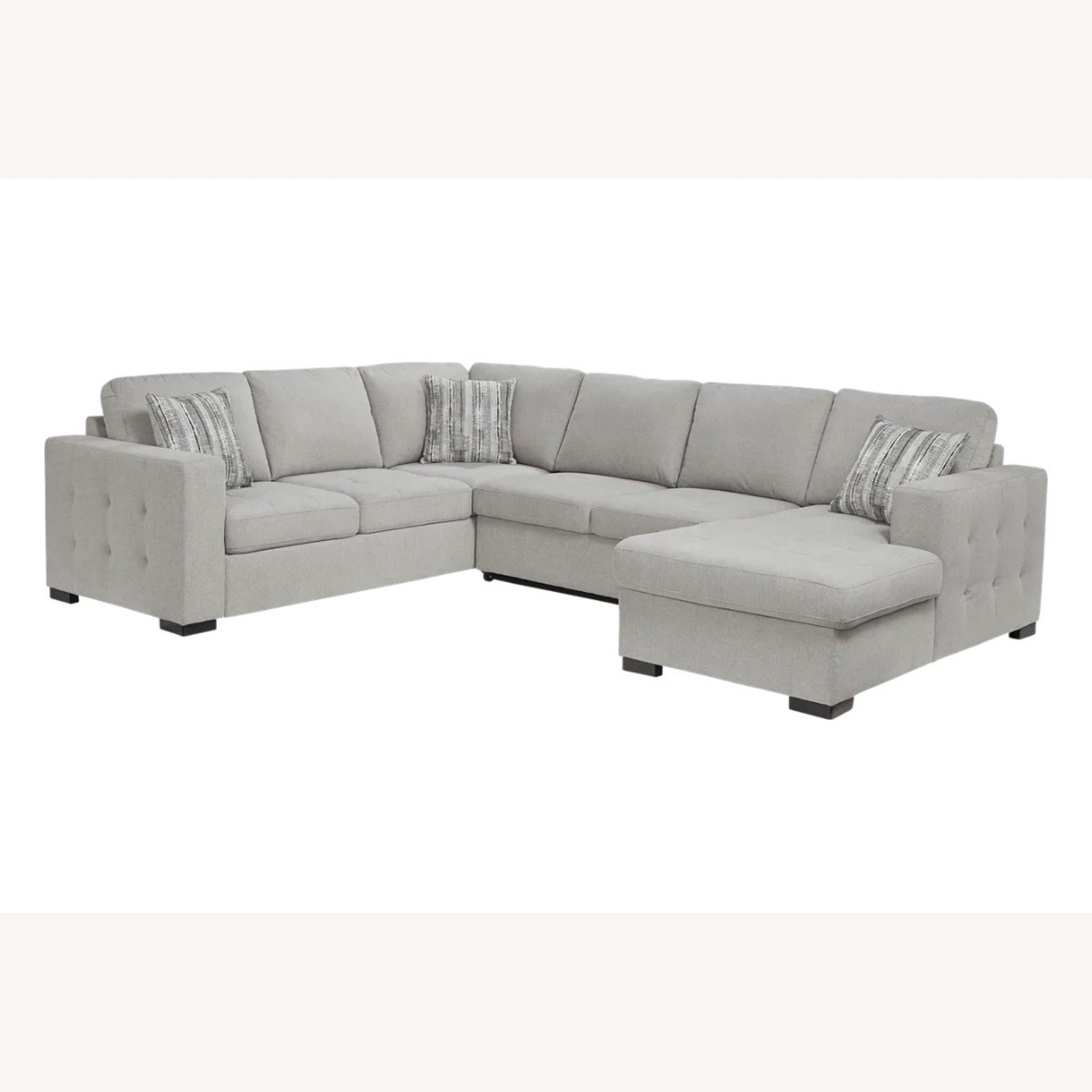You no longer have to choose between functionality and style with the innovative design of the Angelino Heights sleeper sectional. Featuring sectional seating for up to six adults, this versatile sectional includes a fold out queen size sleeper and storage compartment in the end chaise. Upholstered in textured woven gray fabric, this contemporary sectional features delicate tufting detailing on the exterior arms and seat cushions. Included accent pillows add a stylish touch. 100% Polyester.
