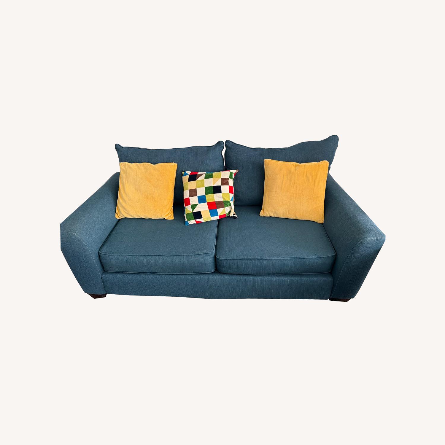 Seller's Notes:This stylish, modern loveseat comes in a rich teal fabric with two soft golden-yellow pillows and one colorful checkered accent pillow for a vibrant, cheerful look. It’s perfect for apartments or smaller living rooms, comfortably seating two adults while still feeling spacious. The cushions are supportive yet comfy, and the fabric has held up well in a clean, smoke‑free home