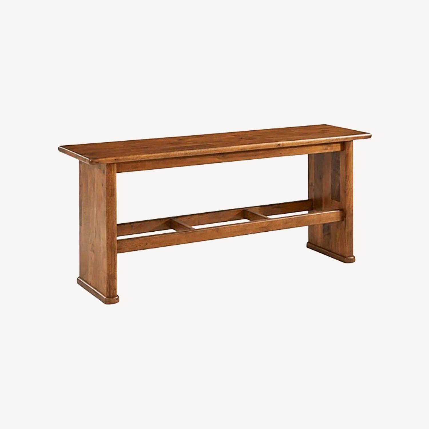 Seller's Notes:Exquisitely detailed, the elegant charm of the counter height Surrey Ellis bench is underlined by an exacting attention to even the smallest elements that make it unique. The bold lines of this piece, including a pair of stretchers for support, are finished in brown mango veneers. Trim details surrounding each pedestal foot add an elegant final touch.