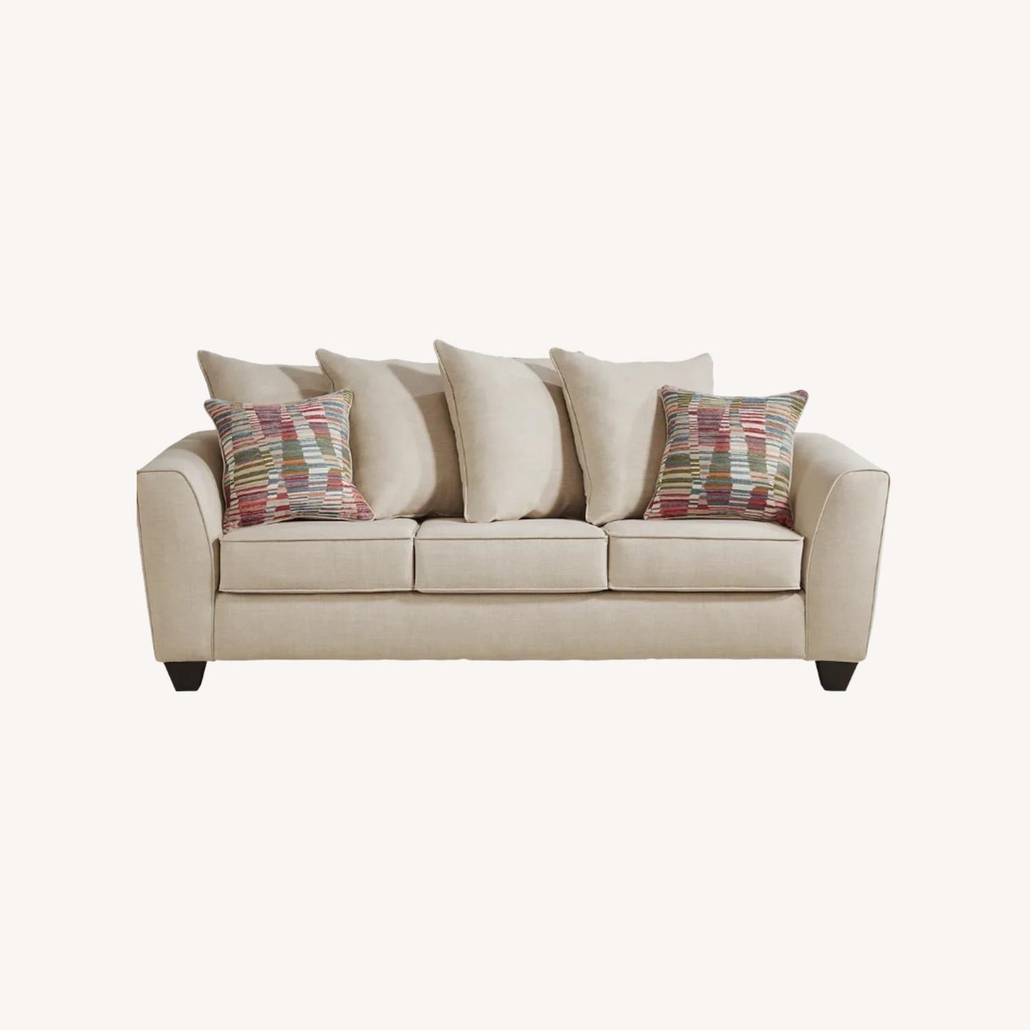 A blend of timeless and sophisticated style, the Primwell Place sofa invites cozy comfort to any space. Upholstered in beige woven fabric, this collection features reversible seat cushions for long-lasting style. Large scatter back pillows provide comfy support as sleek, straight lines add a contemporary touch. Flare arms, block legs and multicolored accent pillows enhance the transitional look. 100% Polyester.