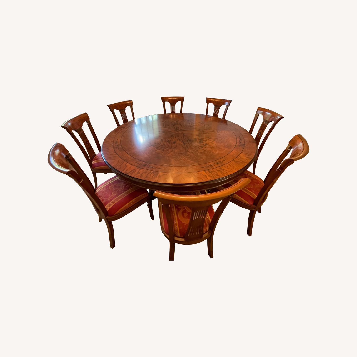 Seller's Notes:This gorgeous table sports decorative ebony inlays and spectacular graining assembled in four quadrants. 70” diameter with 3” apron. Easily seats eight. Sits on a pedestal with four decorative feet (42” diameter of feet). Made in Italy and purchased originally from Millhouse Antiques in NJ. Comes with soft pad for top. In basically perfect condition. Chairs NOT included. I’m selling 8 elegant Greek revival dining chairs separately that were used with this table, check them out!