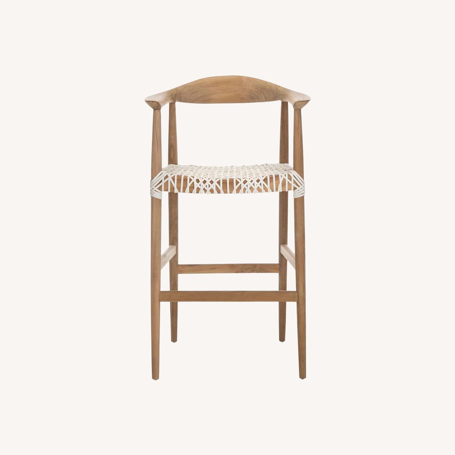 Seller's Notes:SOLD AS SET OF TWO STOOLS: The Bandelier Bar Stool highlights all the best of contemporary design: clean lines, subtle curves, and stunning designer details. Bandelier gives any decor a trendsetting aesthetic with its woven white leather seat in a geometric lattice, beautifully offsetting its smoothly curved natural teak frame.