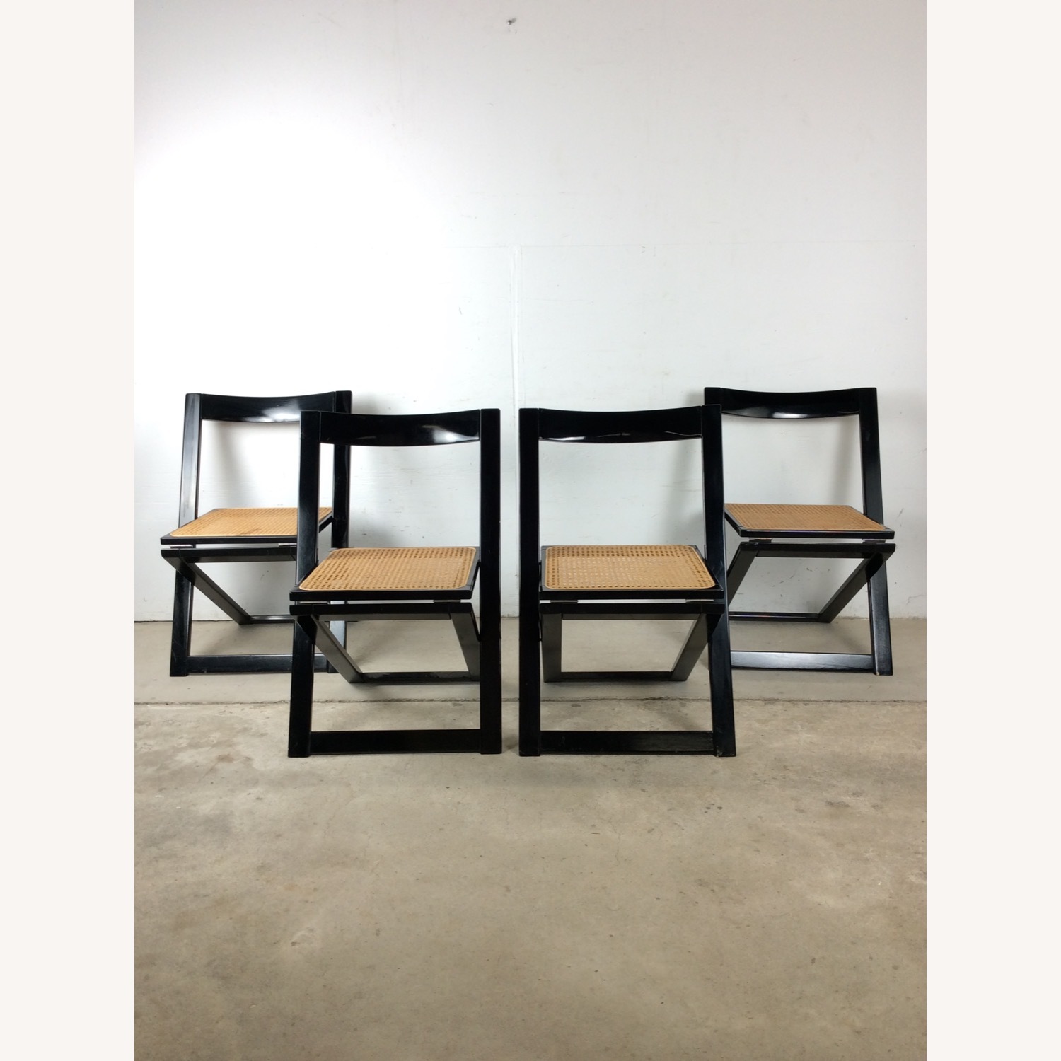 Seller's Notes:This set of four mid century folding chairs features hardwood construction, original black lacquer finish, and beautiful caned seats offering stunning occasional seating but also suitable for every day use. Dimensions: 20.5w 23 31h 17.5sh Condition notes: Original black lacquer finish is in good condition with only minor scuffs, slight scratches, and small edge dings. Caning is perfect. No holes, tears, rips, or sunken seats. 9.5/10