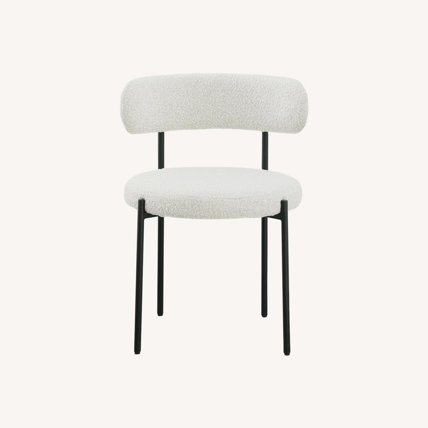 Liven up your dining area with this Sherwood boucle fabric dining chair. Crafted from iron and boucle fabric, this chair is both sturdy and cozy. Its matte metal frame provides foundational support while its curved seat and backrest provide physical support for those who sit in it. Its rounded appearance gives it a contemporary look that is perfect for any modern living space. This chair is just the right height to kick back and enjoy your meal.