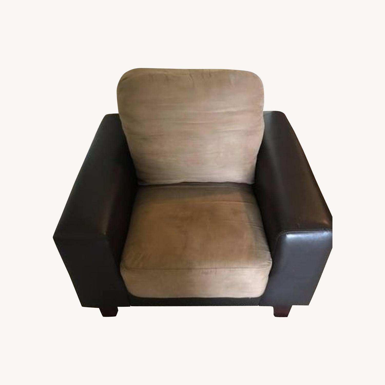 Seller's Notes:Accent chair/Single seater sofa with faux leather arms and back and velvet back and seat cushions. Teakwood frames. The velvet material gives the discoloration effect. The color has not faded. Used like new. Smoke-free pet-free home. No damages. must go