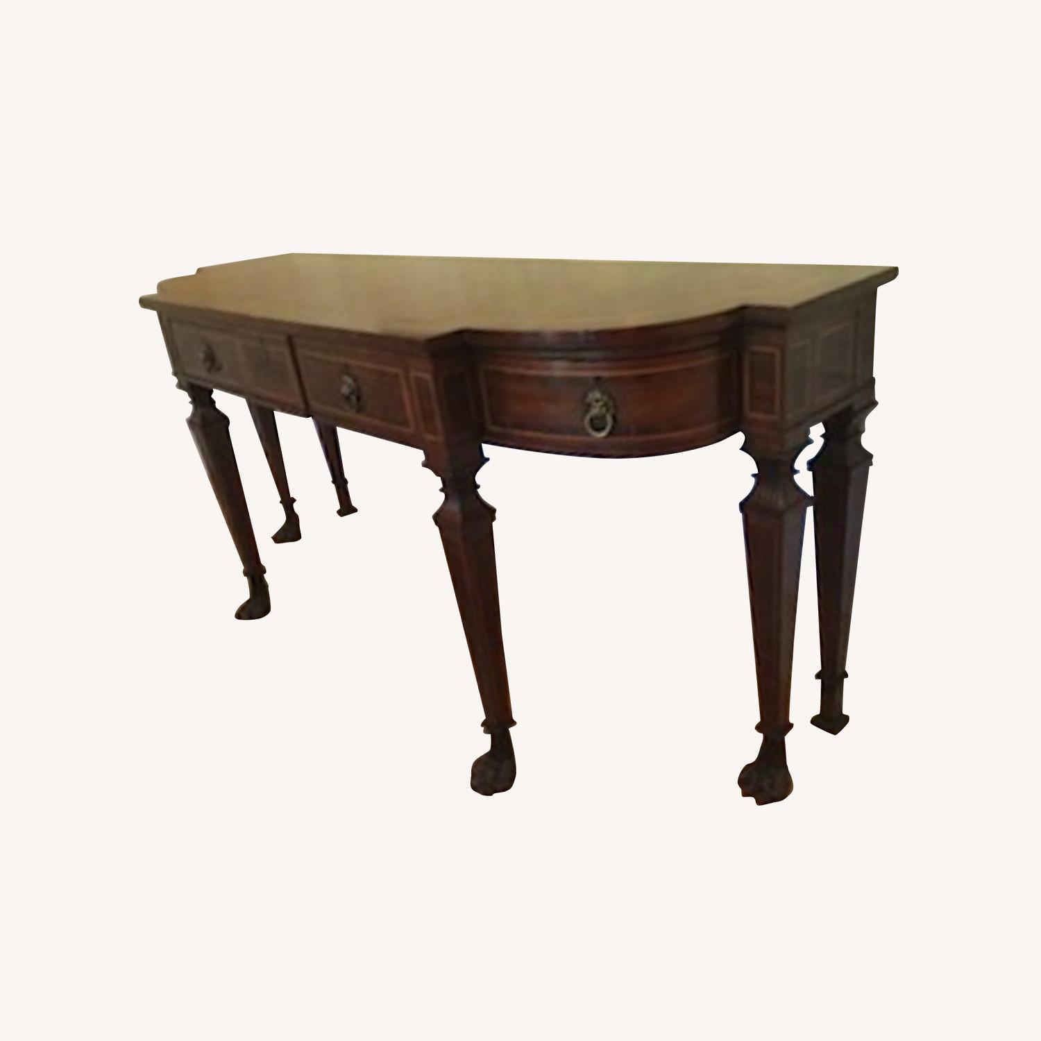 Seller's Notes:Solid mahogany sideboard console table. Highest quality. Pristine condition. No scratches or imperfections. Incredible detailed craftsmanship. Must see to appreciate scale and quality. Purchased for $9,000. A truly remarkable piece of furniture and one of a kind. Dimensions: 88" long x 27" wide x 38".
