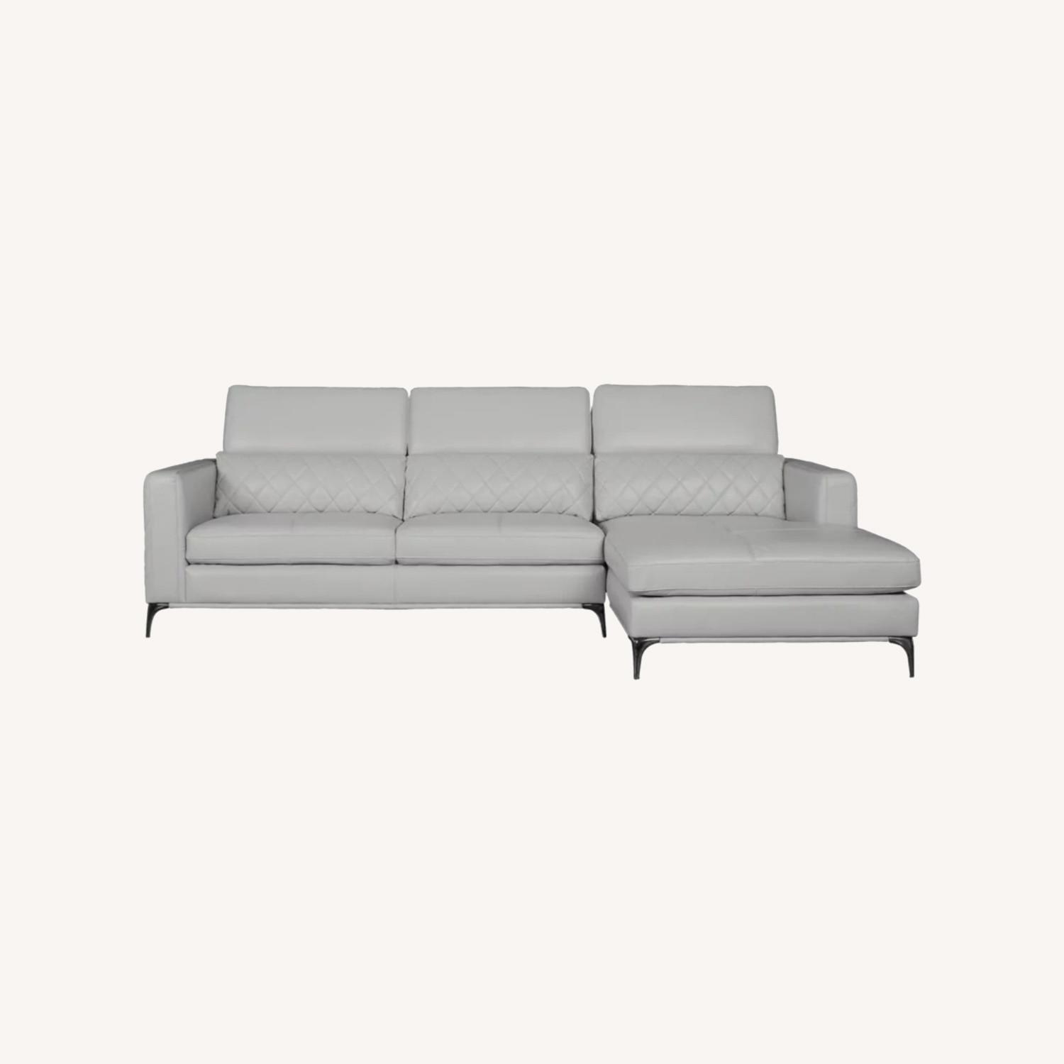 Modern elegance with a contemporary twist, the Sorrento sectional offers indulgent comfort with a side of quality. Upholstered in platinum high performance fabric, this sectional is far from ordinary thanks to special touches such as quilted back cushions, ratchet style headrests, contrasting stitching and sleek chrome finished legs. Seating up to three adults, this luxurious sectional takes center stage in any living space. Upholstery: 85% Polyester, 15% Polyurethane