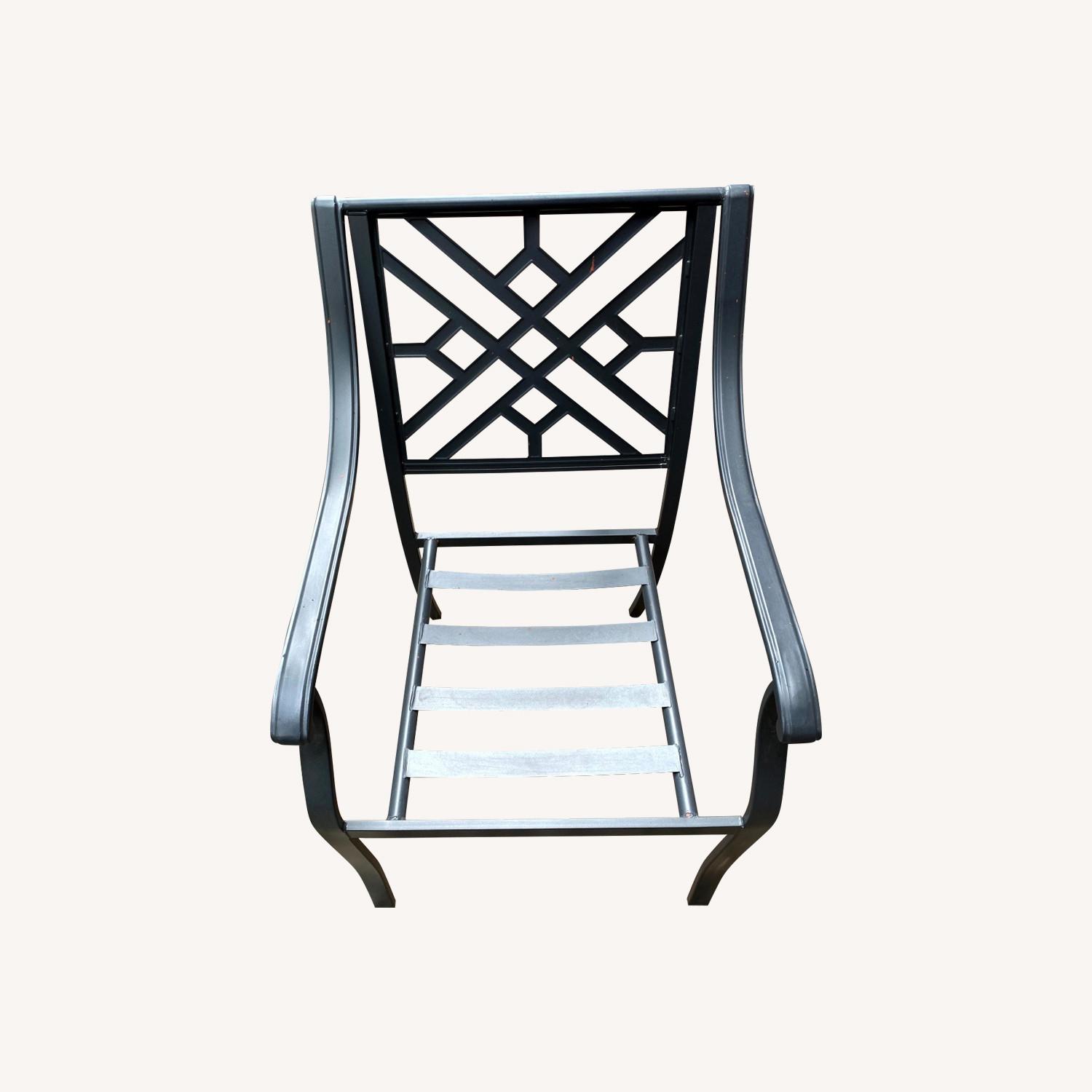 Seller's Notes:These chairs feature a heavy-duty steel frame with weather-resistant olefin cushions. With a stylish lattice-back design and an appealing curved framework, these patio dining chairs provide enhanced comfort and come fully assembled. Elliot Creek set of 4 stackable steel dining chairs with gray cushion seat. Slate powder-coated steel frame ensures durability. Olefin fabric covers with foam cushions. Selling because moving.