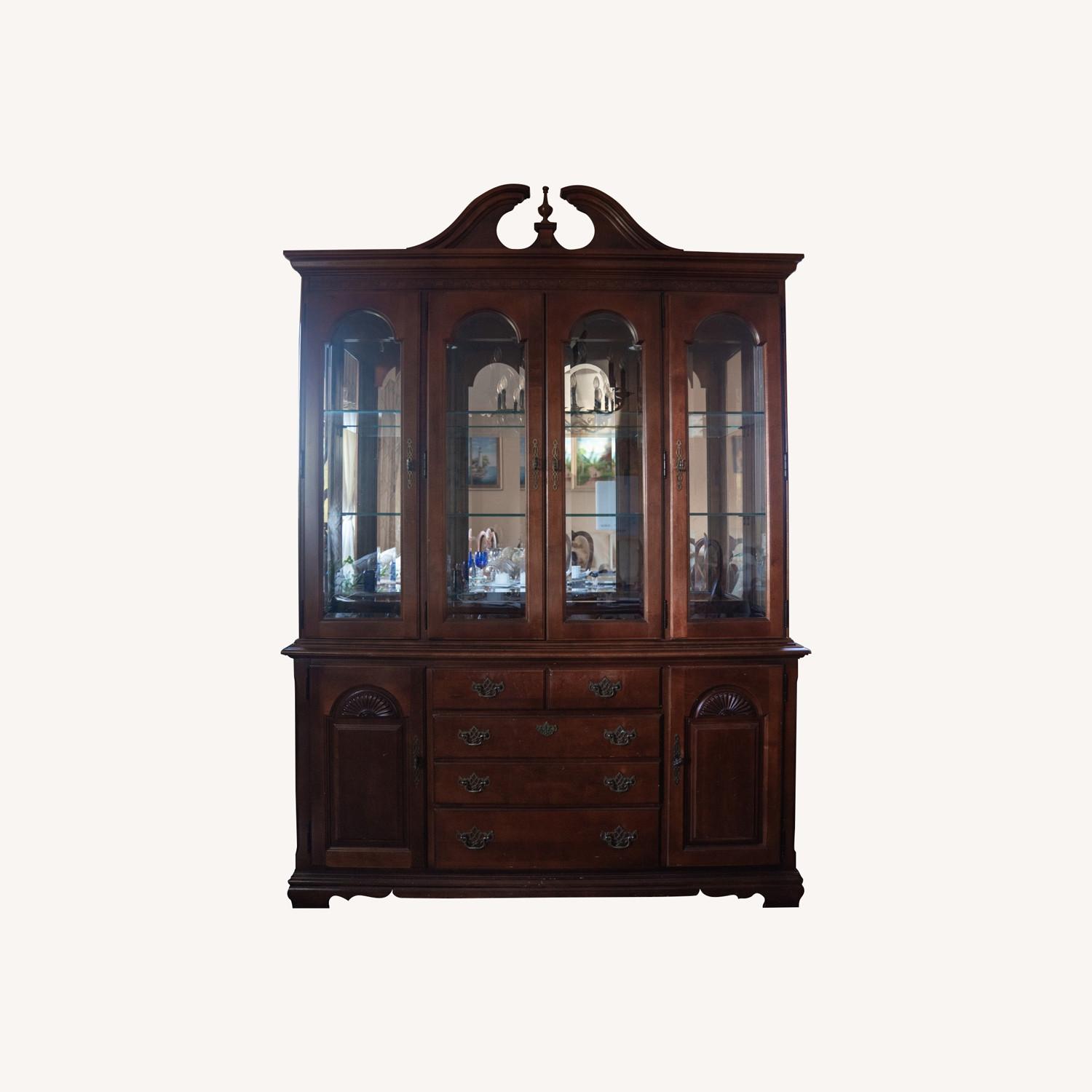 Seller's Notes:The American Craftsman Collection by Stanley Furniture. This charming china cabinet features a cherry wood finish, four glass doors on the top which open via brass knobs, and glass shelves within. The bottom half features dovetail drawers which open via brass handles.