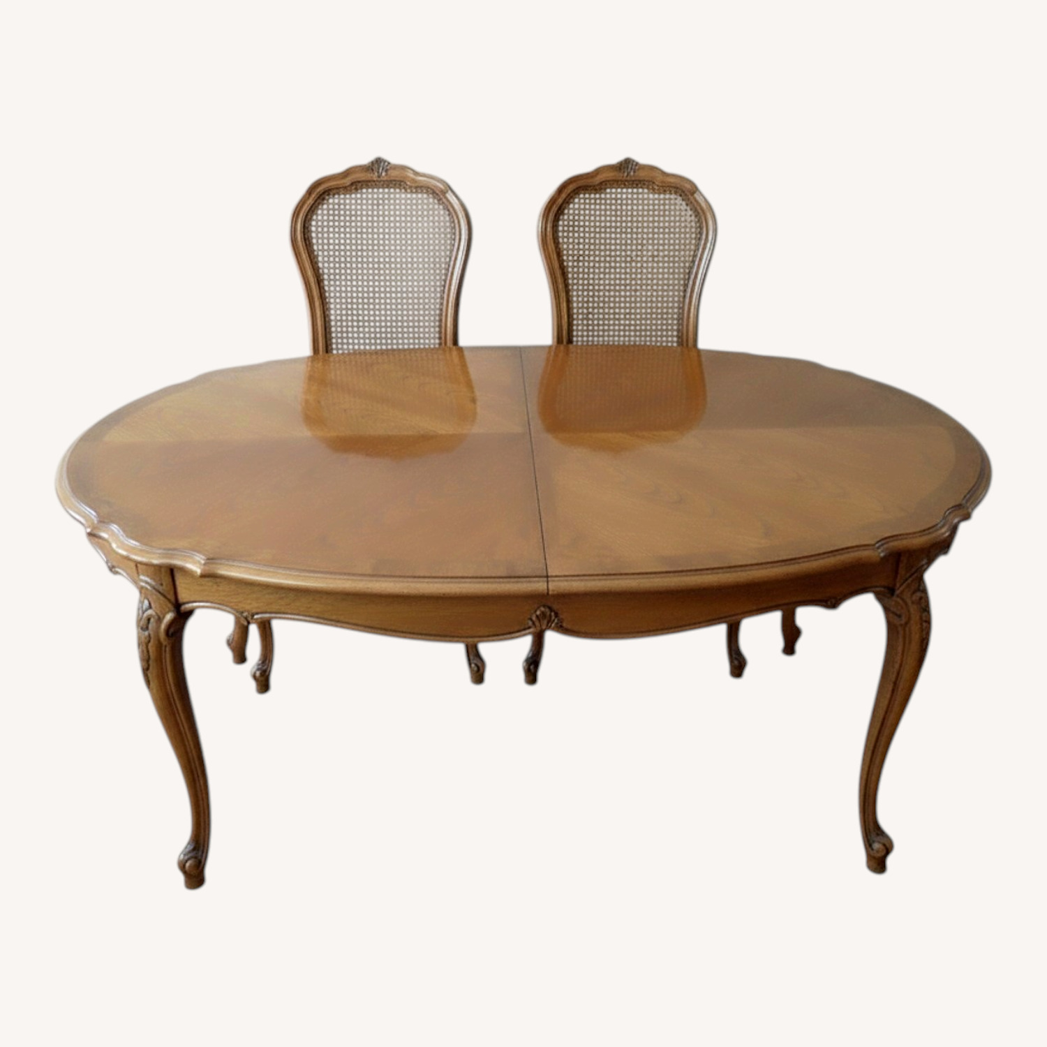 Seller's Notes:Purchased in 1987 and scrupulously cared for. This French Court dining set includes six chairs and two 22-inch leaves with individual storage cases. A matching china cabinet and server are offered separately.