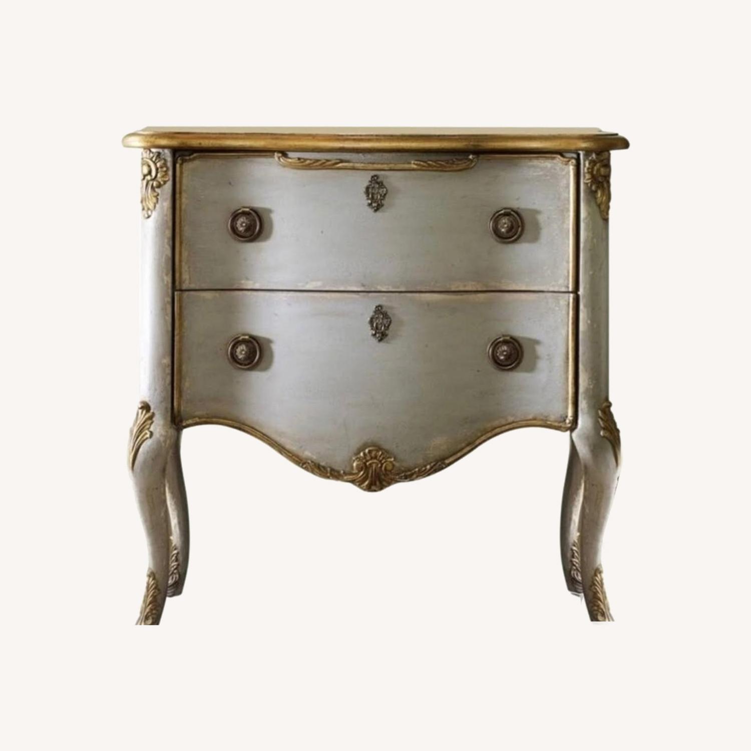 Seller's Notes:Graceful and romantic, this enchanting soft gray chest is offered in a vintage French style with exquisite design details like gold leafing, shapely cabriole legs and a gold-leaf ornamental keyhole escutcheon on each drawer. Crafted of Poplar Solids and Gold Leaf, it features two drawers and is a compact 30 inches wide.