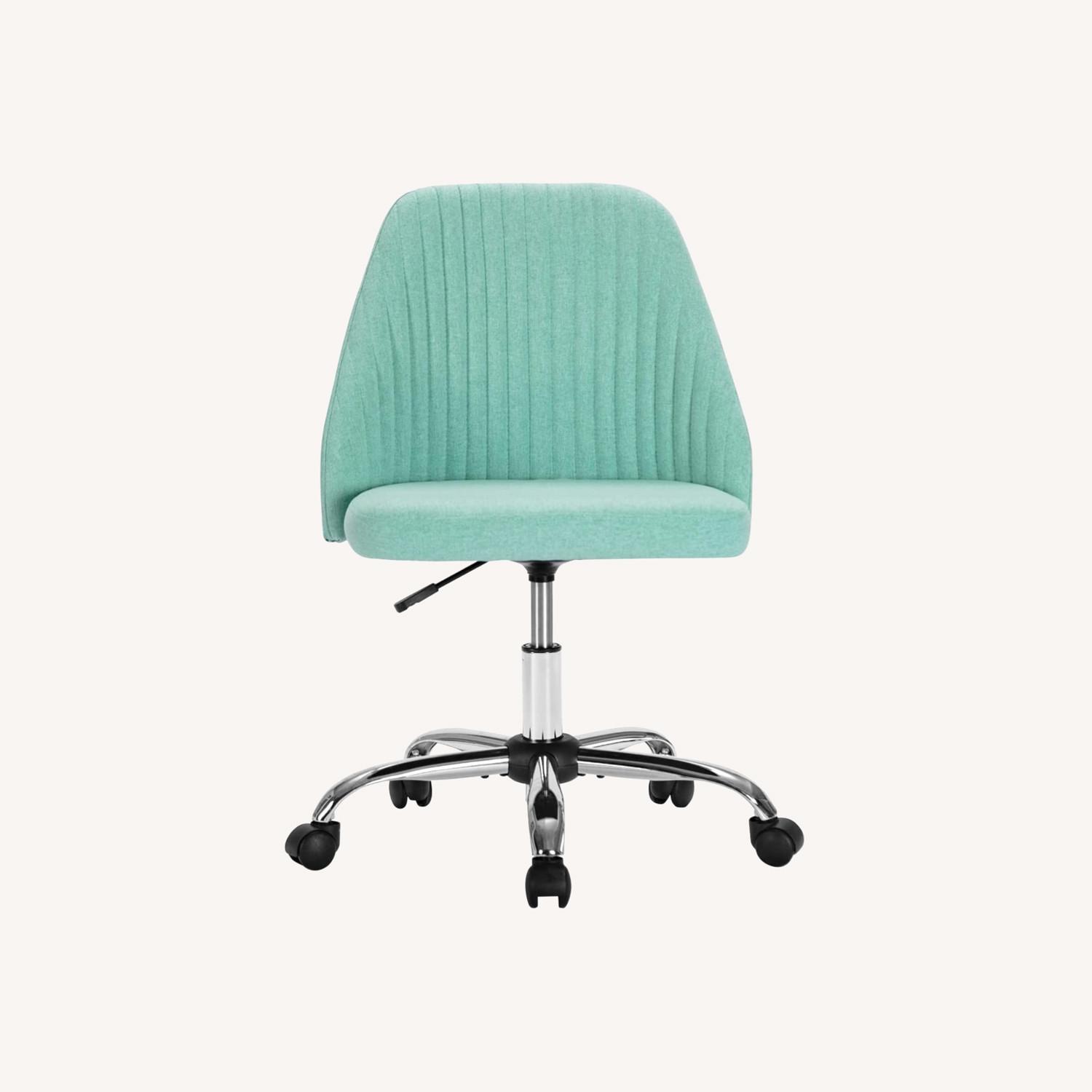 Seller's Notes:Armless home office/study chair. Less than 6 months old, barely used, sturdy, no stains or tears, smooth gliding and nearly new. Beautiful blue/turquoise color accent. Soft PU casters, 360 degree quiet rotation, friendly on hardwood floor or carpet. High density sponge cushion allowing for flexibility, with good lumbar support.