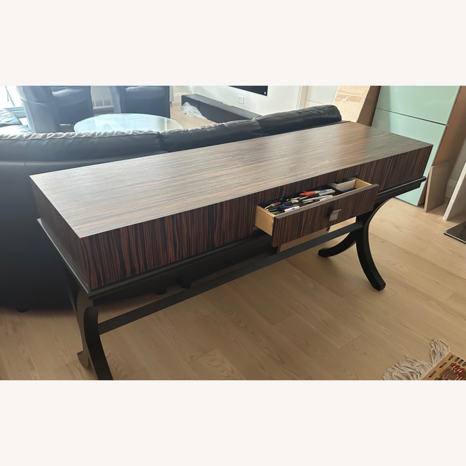 Seller's Notes:Beautiful art deco console table - crafted in Canada, macassar wood - black brown, center drawer, curved legs. Multi-purpose - perfect as entryway console, tv stand or writing desk. Bought in North Carolina furniture mart several years ago, no longer works in my new apartment.