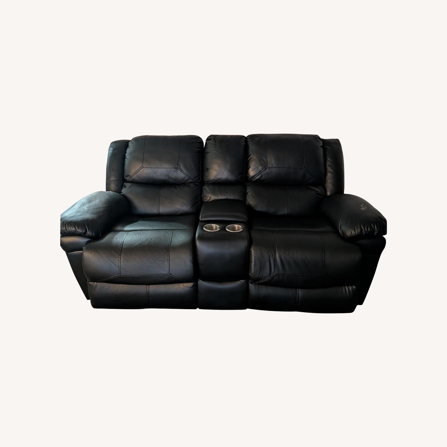 Seller's Notes:Used reclining loveseat from Value City Furniture. Black faux-leather upholstery with dual recliners and center console with cup holders. Clean, comfortable, and fully functional. Shows light normal wear from use. Great for a living room, den, or media space.