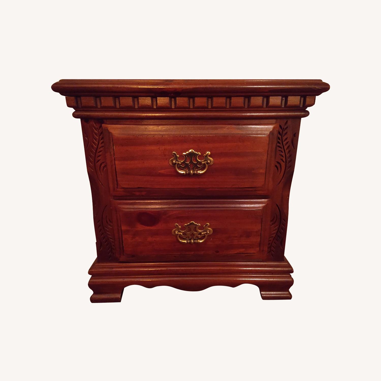 Seller's Notes:Vaughan Bassett Furniture Company from Galax, VA. This piece is a two-drawer nightstand. These bedroom furniture pieces were puchased at least 35 years ago and have been in two (2) smoke and pet free homes. There are some minor scratches on the top as seen in the photo but otherwise in very good condition with many years left! All original hardware!