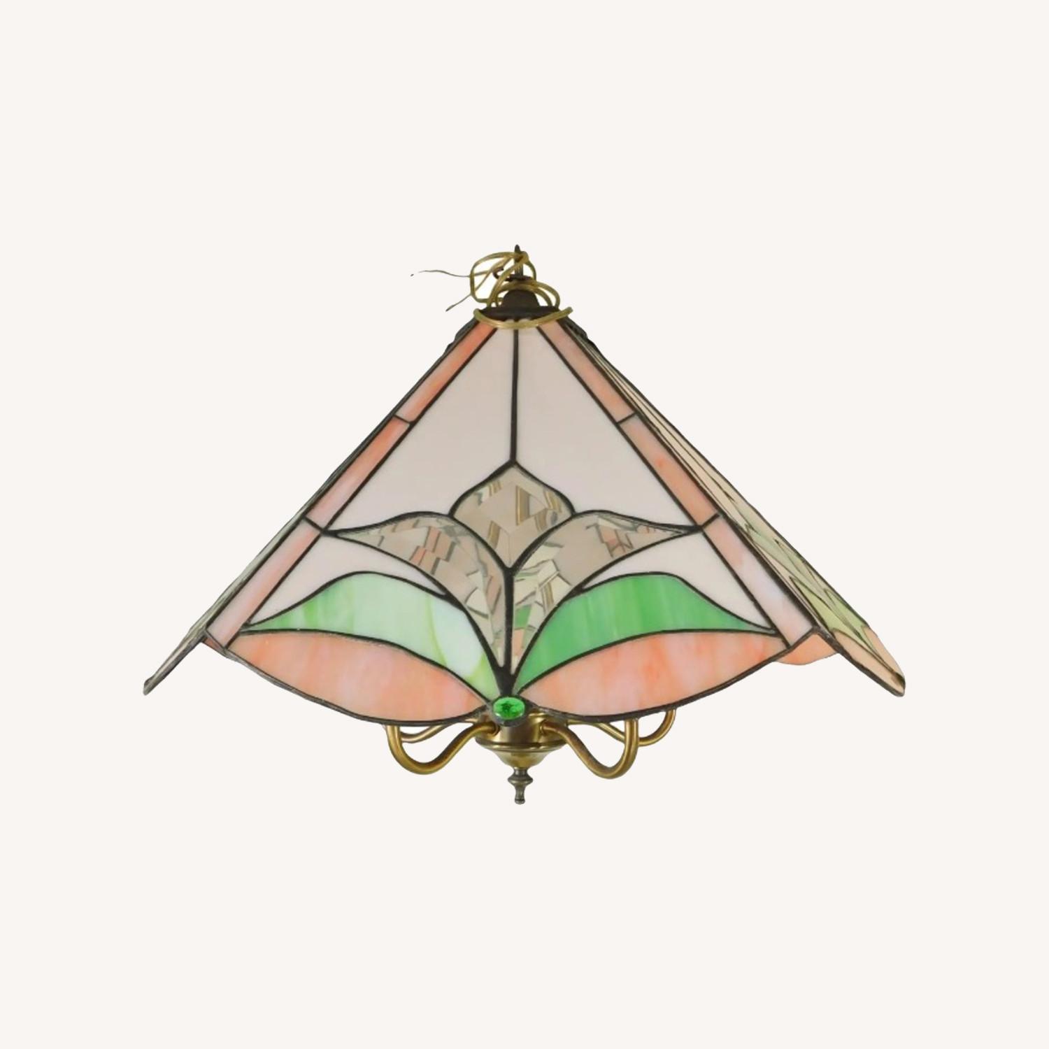 Seller's Notes:Beautiful vintage mid century pink and green stained glass and brass 5 light chandelier. Made in the USA - Circa 1970s. Wonderful ornate shape and design. Brass 5 light candelabra underneath. Works perfectly! No breaks, cracks, repairs, or damage. Chain has already been added (shown in some pictures). Enjoy!