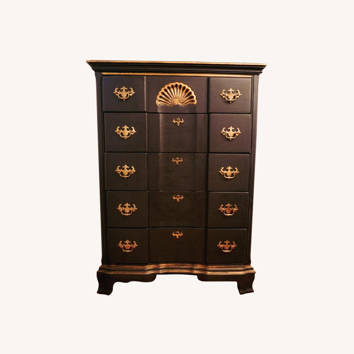 Seller's Notes:Painted matte black vintage dresser from a beautiful estate sale. Gold seashell carving original to the piece, with original gold hardware. Sides have a floral 1600s painting from the Royal Horticultural Society. Drawers look good as new inside, with a few marks all the way at the back.