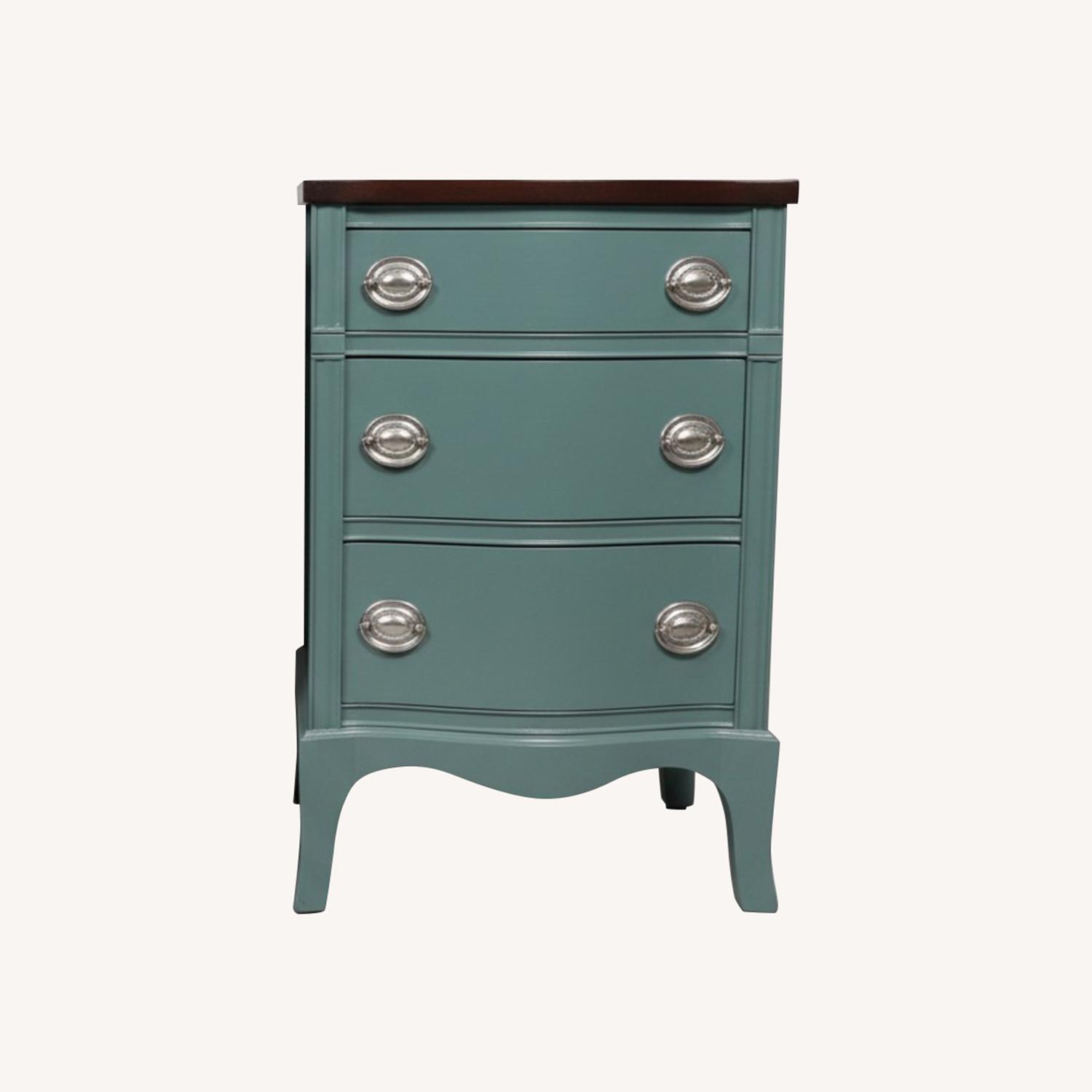 Seller's Notes:Drexel Furniture Company, founded in 1903 in Drexel, North Carolina, is renowned for producing high-quality, stylist furniture. During the mid 20th century, Drexel gained prominence for its innovative designs and collaborations. Their pieces often reflect the popular styles of their time, blending functionality with anesthetic appeal. These beautiful matching nightstands have been refinished in a soft teal/blue-green finish with rich walnut wood stain on top. All drawer have their original silver hardware. Their curved legs give it a classic, timeless look. These nightstands have three drawers each which slide very gracefully and securely. They are not only unique but a rare find making it the perfect pieces for your bedroom. The curved drawer fronts and brass hardware are characteristic of designs from the 1950 and 1960s. Drexel furniture from this period is often sought after for its craftsmanship and classic design elements. Here’s your chance to own a set of these masterpieces. They are clean, stylish and functional with plenty of storage. Great statement pieces that add character without overpowering a room. ✨ Refinished with professional Eco Friendly Paint and Sealed for Durability. ✨ Solid Wood with 3 Drawers ✨ Measurements: 18.25" L x 16.25” W x 28" H ⭐️⭐️ Please take into consideration that all our furniture pieces are secondhand. Which may result in them having minor imperfections consistent with their age. They have been refinished and restored to the best of our ability. Those minor imperfections that still remain make them a part of their history. ⭐️⭐️