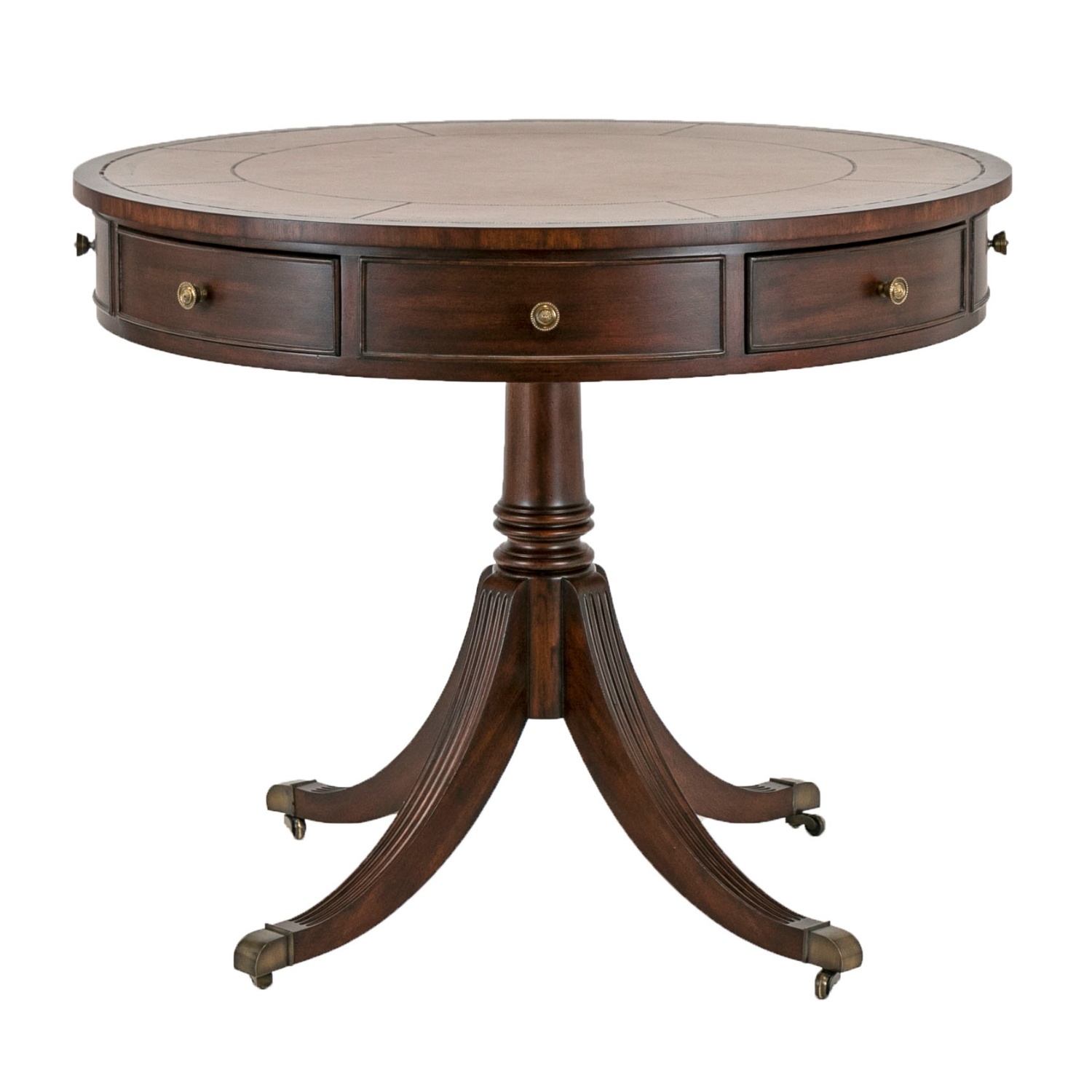 This round rent table from the Bradford collection by Ethan Allen Furniture offers a handsome piece of furniture to add to the living space. Featuring four functional and four false drawers, this table has a tooled leather top panel with gold-leaf etching for a decorative flair. Rests on four reeded legs with brass capped feet and mounted on casters for ease of movement.