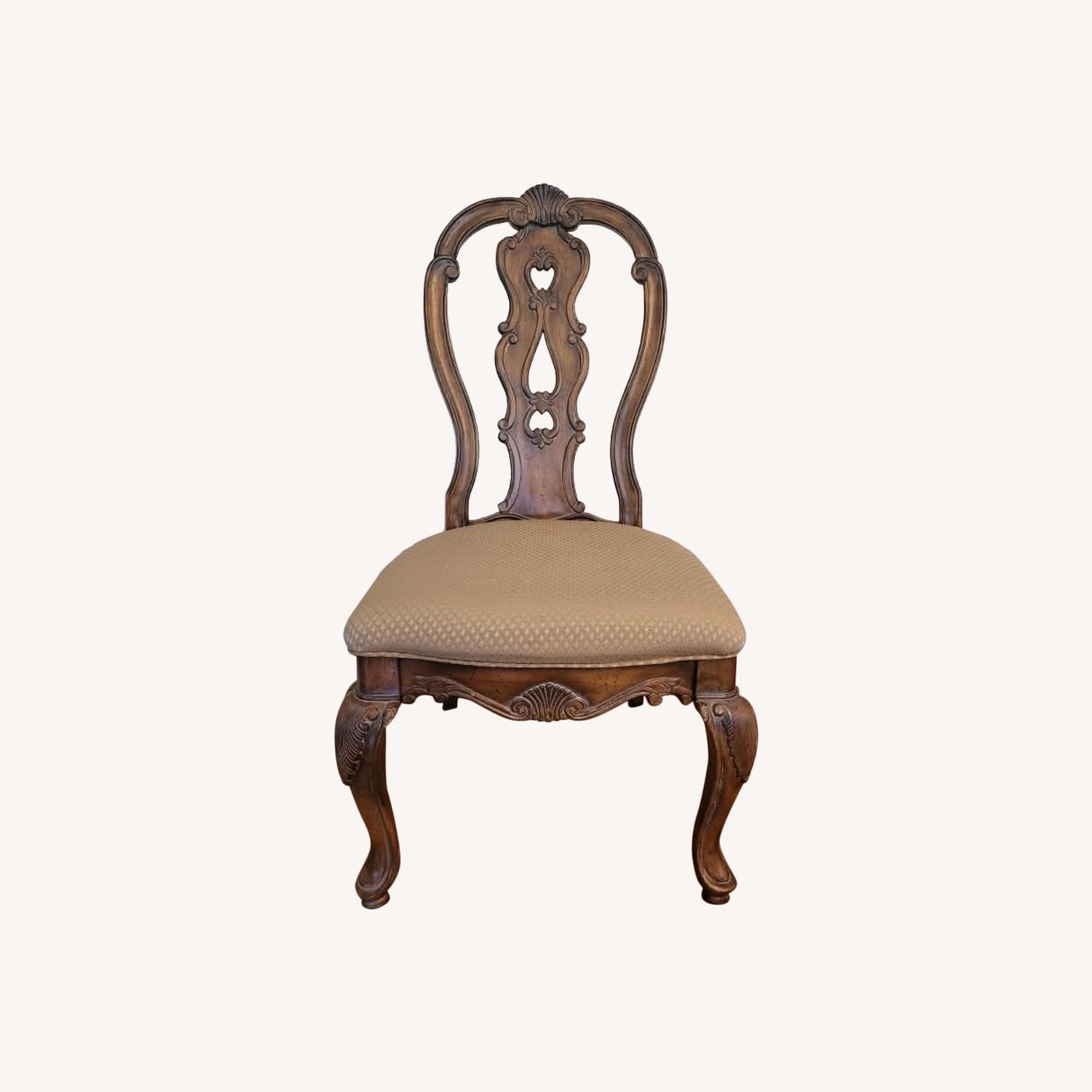 Seller's Notes:Two chairs have armrests, six do not have armrests. One chair without armrest has a tear in cushion. Wood is in perfect condition, and VERY sturdy. Beautiful chairs, just very large and will not fit in our space.