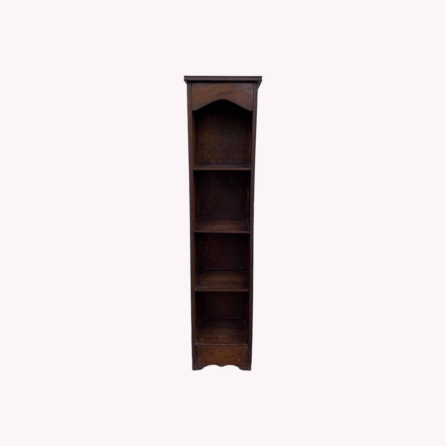 Seller's Notes:This vintage wooden bookcase features solid wood construction, original dark stain, unique narrow design, four shelves, and carved wood detailing at top and base. Shelf dimensions: 9w 7d 8.25h (top) 9.75h (rest) Dimensions: 11.25w 7.5d 49h Condition notes: Original finish shows some wear with staining on the top (see photos), scuffs and scratches through out. This is a very sturdy and solid piece of furniture. It was previously used as a retail display full of books where it did not buckle, waiver, or tip. 8.5/10