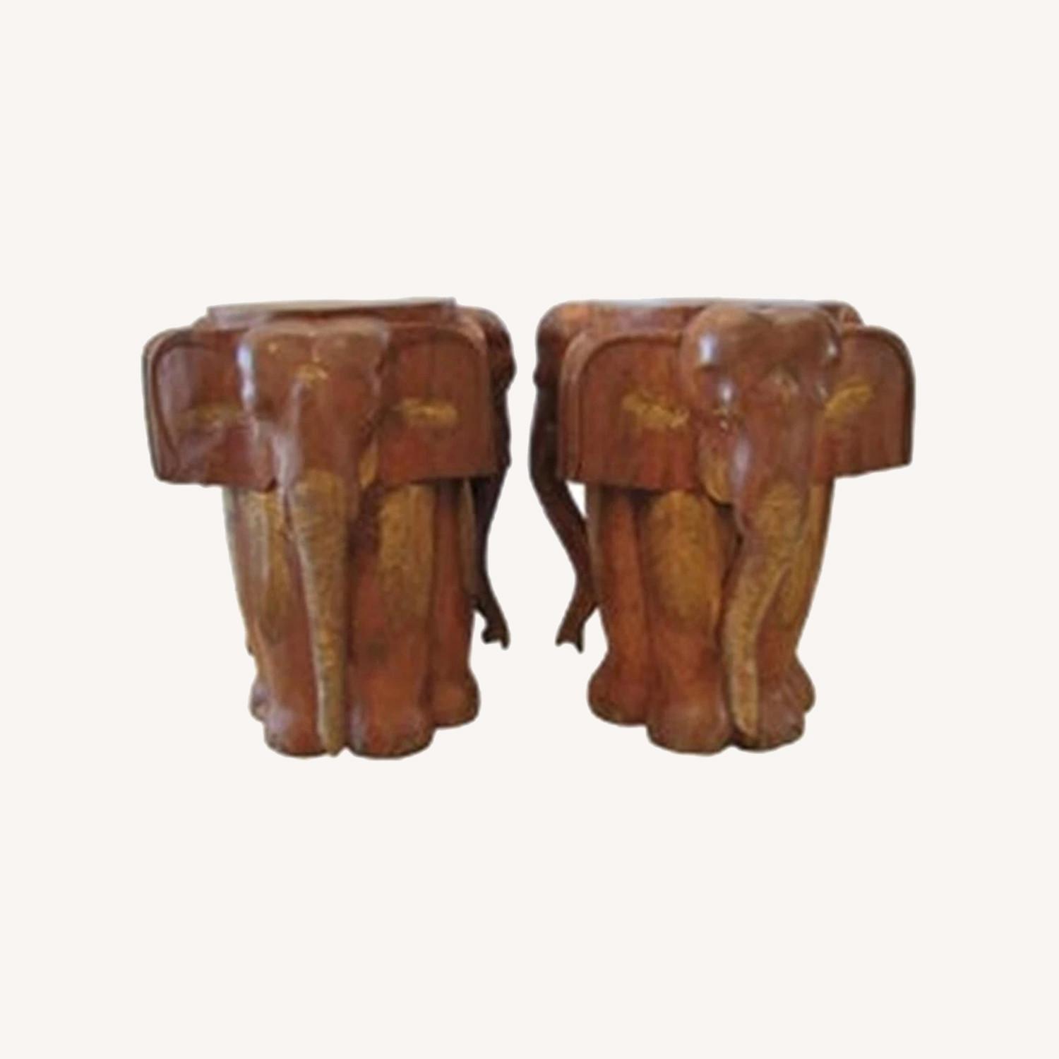 Seller's Notes:Vintage Matched Pair Carved Wood Elephant Stools / Tables circa 1970's This matched pair of stools / tables / plant stands are hand carved solid wood. Each depicts three elephants and the carvings accented with gold leaf. Each measures 17" diameter and 19" tall.