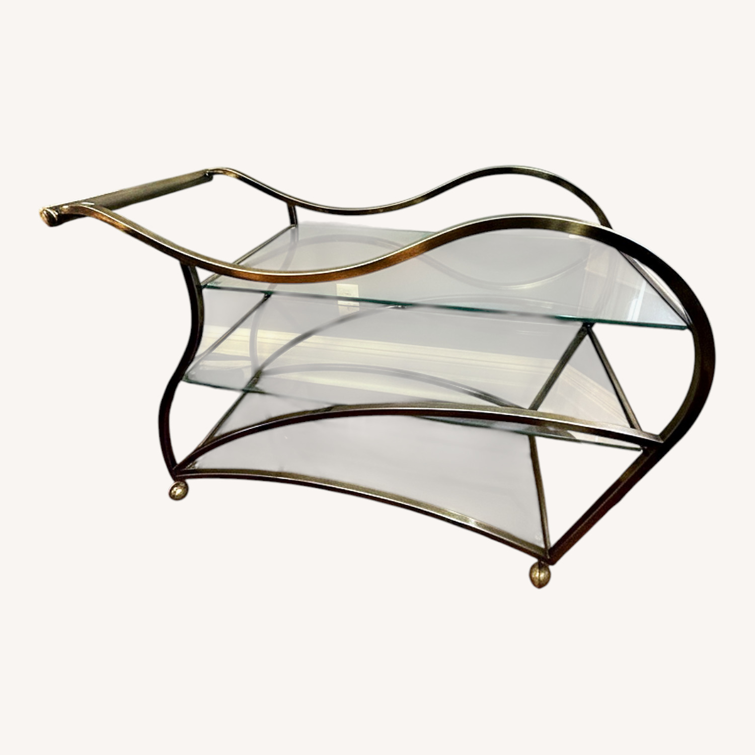 Very good vintage condition. Structurally sound with wear consistent with age and use, including minor wear to brass on handles, light surface scratches to glass, and a gentle patina that enhances its vintage appeal. Overall, a beautifully preserved and highly decorative piece. A rare opportunity to own a designer bar cart that doubles as functional sculpture—perfect for collectors and design enthusiasts alike.