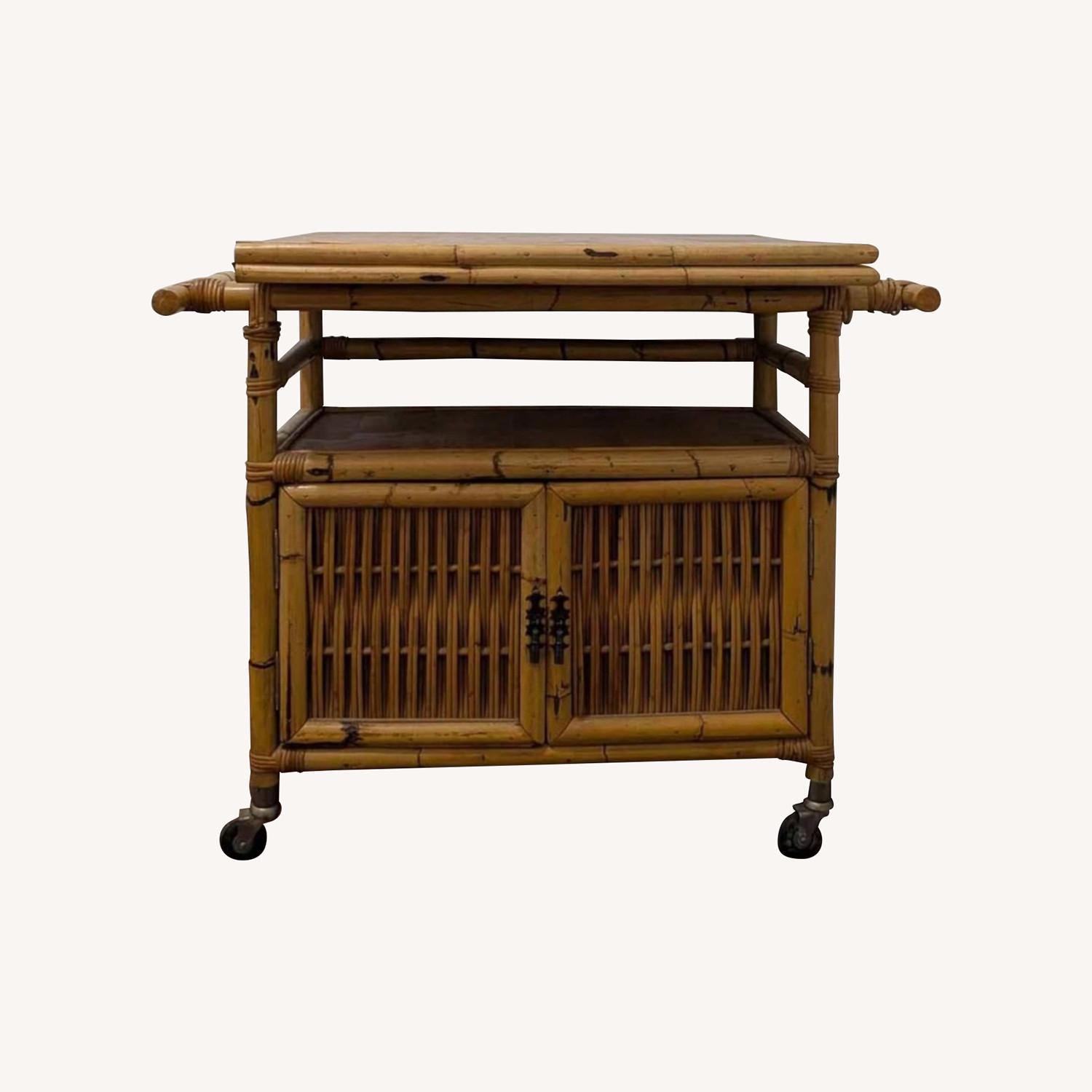 Seller's Notes:Bamboo buffet/bar cart with a tabletop that flips open to give you almost double the amount of space - also has a shelf underneath as well as storage at the bottom with designated slots for liquor bottles or other items! Truly unique and only one more of these seems to be available online at the moment for $3,899 (see last photo). Very minimal signs of wear such as a small stain and a piece of chipped wood. Dimensions: 22.5 inches deep, 37 inches wide, 32 inches tall (60 inches wide when top flipped open)