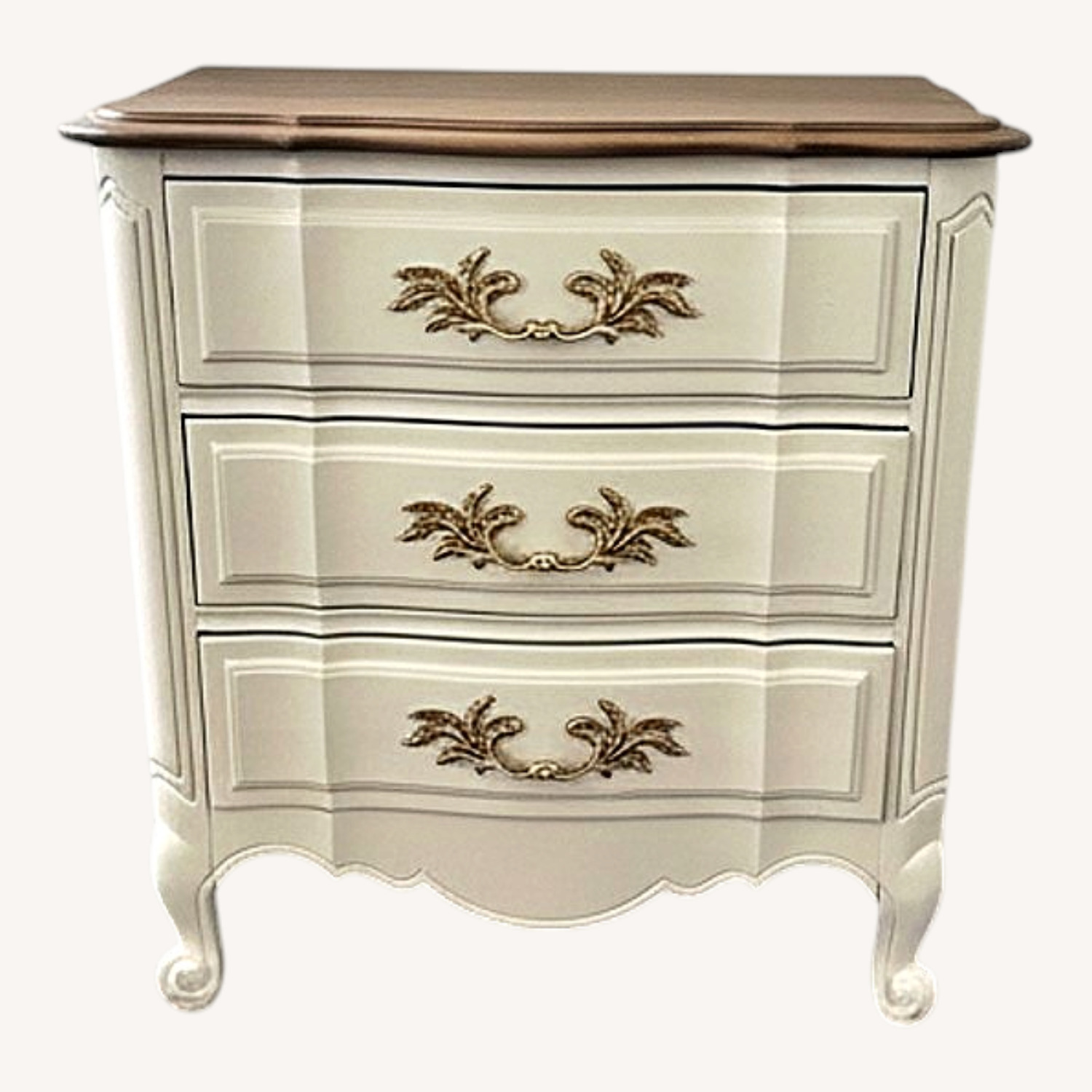 Seller's Notes:Beautiful vintage French provincial nightstand that has been professionally refinished for a timeless, elegant look. Painted in a warm beige Sherwin Williams tone that complements many interior styles including transitional, traditional, and modern farmhouse. The top was sanded down to bare wood and finished with a soft tan wash, then sealed for durability while still showcasing the natural wood grain. Features three smooth-gliding drawers providing great bedside storage. The original ornate hardware was preserved, adding to its classic vintage charm. Perfect as a bedside table, accent table, or small dresser. Dimensions: • 24.25” Length • 15.25” Depth • 25.5” Height Condition: Refinished and in excellent condition. Solid, sturdy, and ready for a new home.
