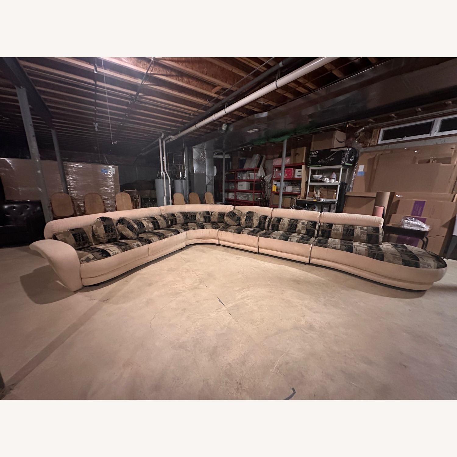 Seller's Notes:Amazing vintage five-piece serpentine sectional sofa by Weiman, likely designed by Vladimir Kagan. The sectional features curved, modular design elements with upholstered seating and a low-profile silhouette typical of Kagan’s iconic mid-century modern style. The sofa sections are upholstered in two-tone fabric and rest on wood plinth bases. Weiman tags intact. Minor wear and stains to fabric. Nothing a good upholstery cleaning could not remove. stunning as is, with endless possibilities to reupholster this timeless postmodern collectible piece. Individual modular sections width measurements are as follows: 80” 52” 36” 36” 60”