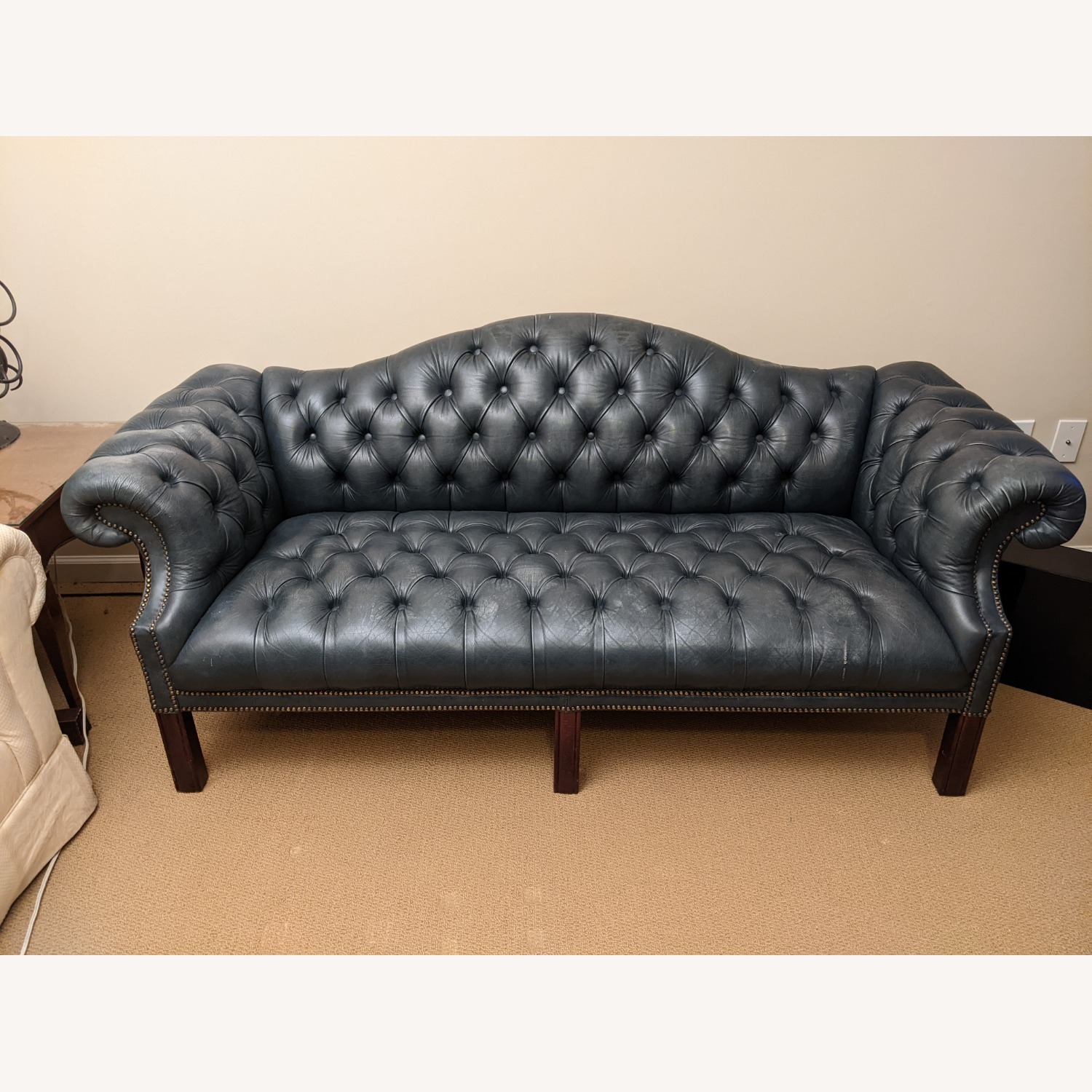 Seller's Notes:Vintage/Antique navy blue leather, button tufted, 3+ seater sofa. Minor color fading due to placing the sofa near a window with the sun shining on it. One minor scratch near front of seat. No holes or punctures.