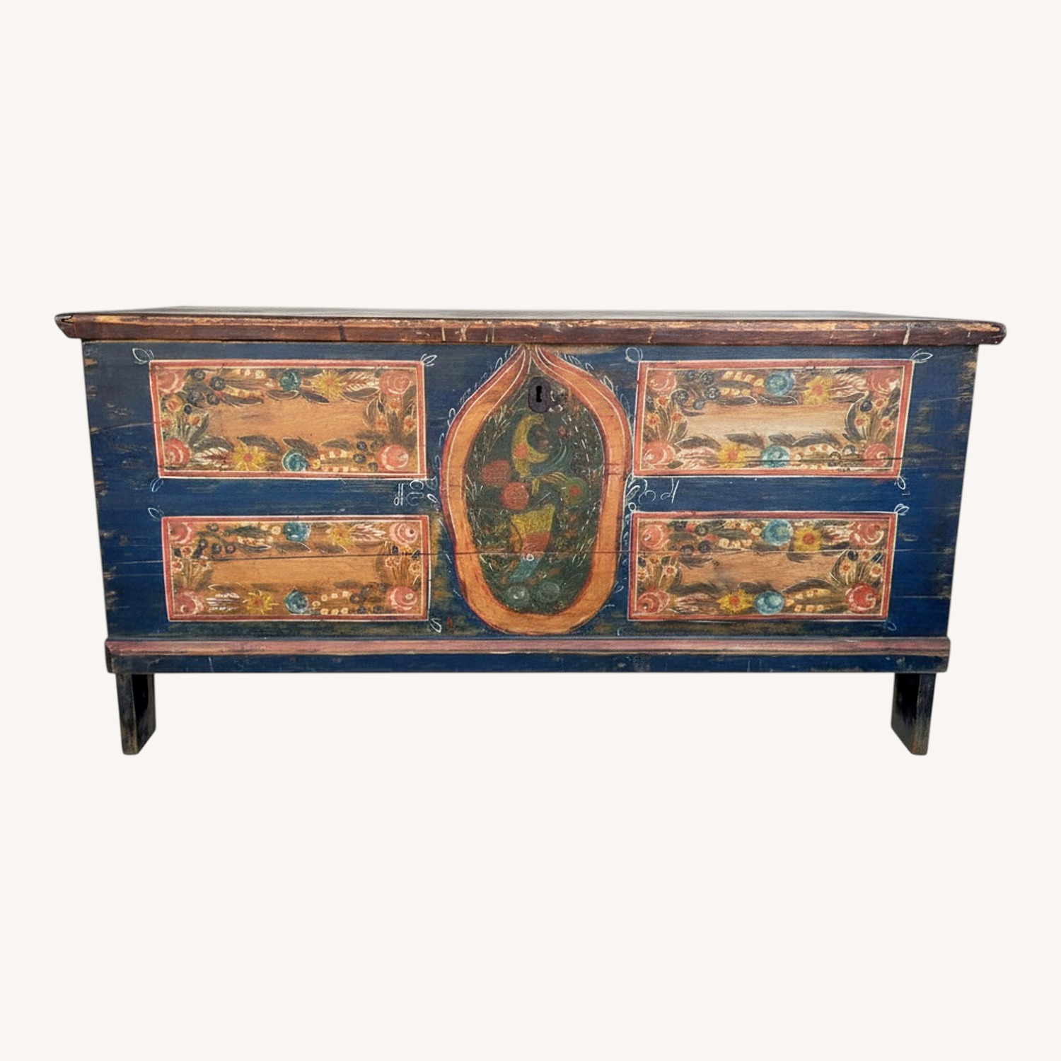 Seller's Notes:Oversized and hand painted with blues, floral motif and large bird figure in the center image. We especial like the way the old growth white pine wood was allowed to remain visible in each of the rectangular works. End boards retain their original faded red aniline dye surface. Measures 57" across x 29" high x 24" deep. Very clean inside. Hand made iron hardware is firmly attached and lid is secure to the chest. Works as it should. No undue splits or cracks. No rot or warping. Normal patina and wear after approximately two centuries. The width of the boards is remarkable! Inside is free of any bad odors or stains. Located in central Ohio.