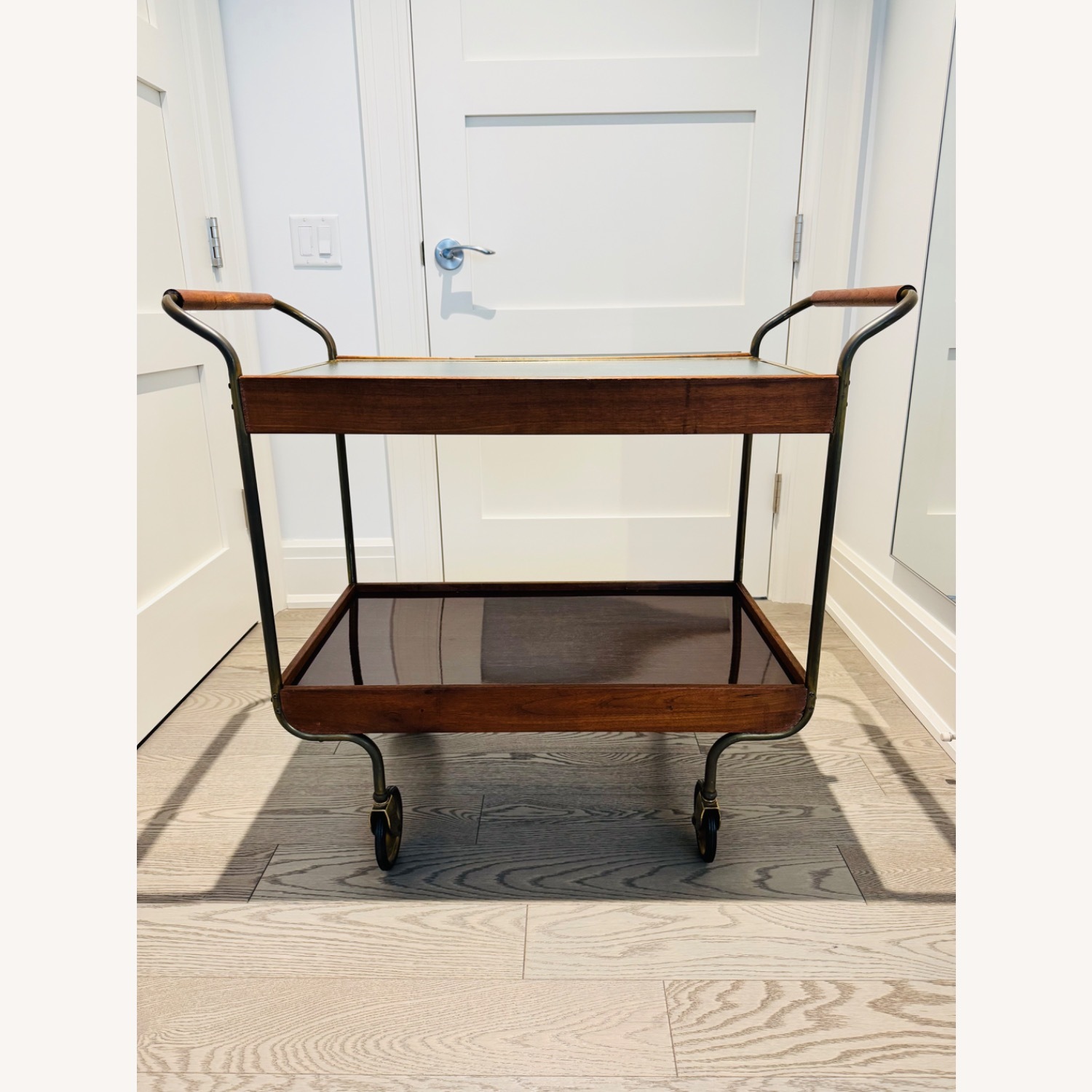 Seller's Notes:This is the Salton Hotable Hotray cart, a mid-century modern serving solution. It was designed in the 1960’s and features an integrated warming tray beneath a glass top (1000 watts). Ideal for keeping food warm for entertaining or meals. The cart is walnut wood frame and handles on two sides. Includes an electrical cord that detaches allowing the piece to be displayed cleanly when not in use. This cart came from the home of my grandmother where it had been loved and used since 1960 and as such has signs of use and age. None of it detracts from the functionality or look of the piece. In real life it is a beautiful example of mid-century modern design.