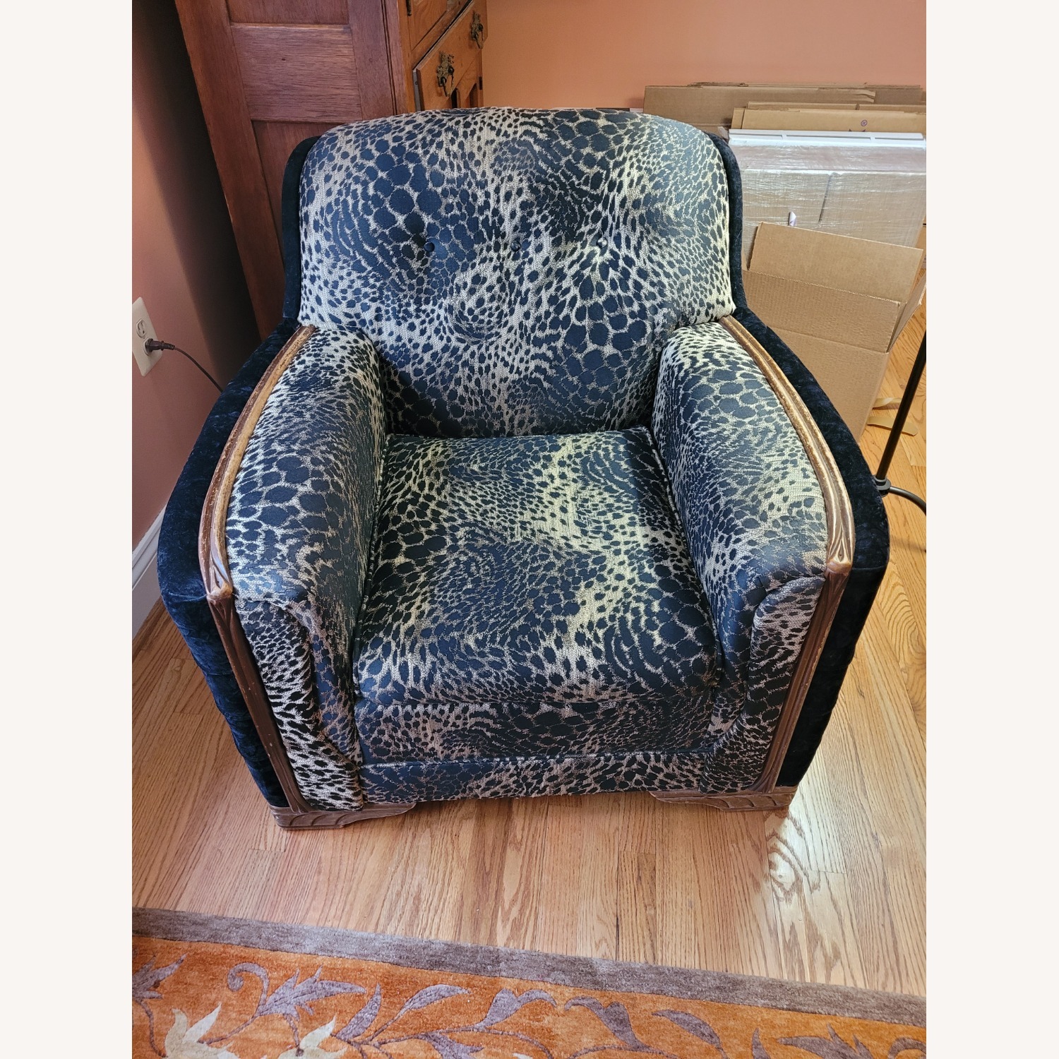 Seller's Notes:This is one chair of a three piece set. The club chair is covered in a dramatic leopard skin material. Our friend had a designer art deco apartment on 23rd Street in Manhattan, and this set was the focal point. When she moved, she gave the set to us. We have treated it with love and care, and regret giving it up, but we are moving. We have listed this as ground floor, but there is a porch with six steps going to the sidewalk. I have put the age at 60, but it may be older.