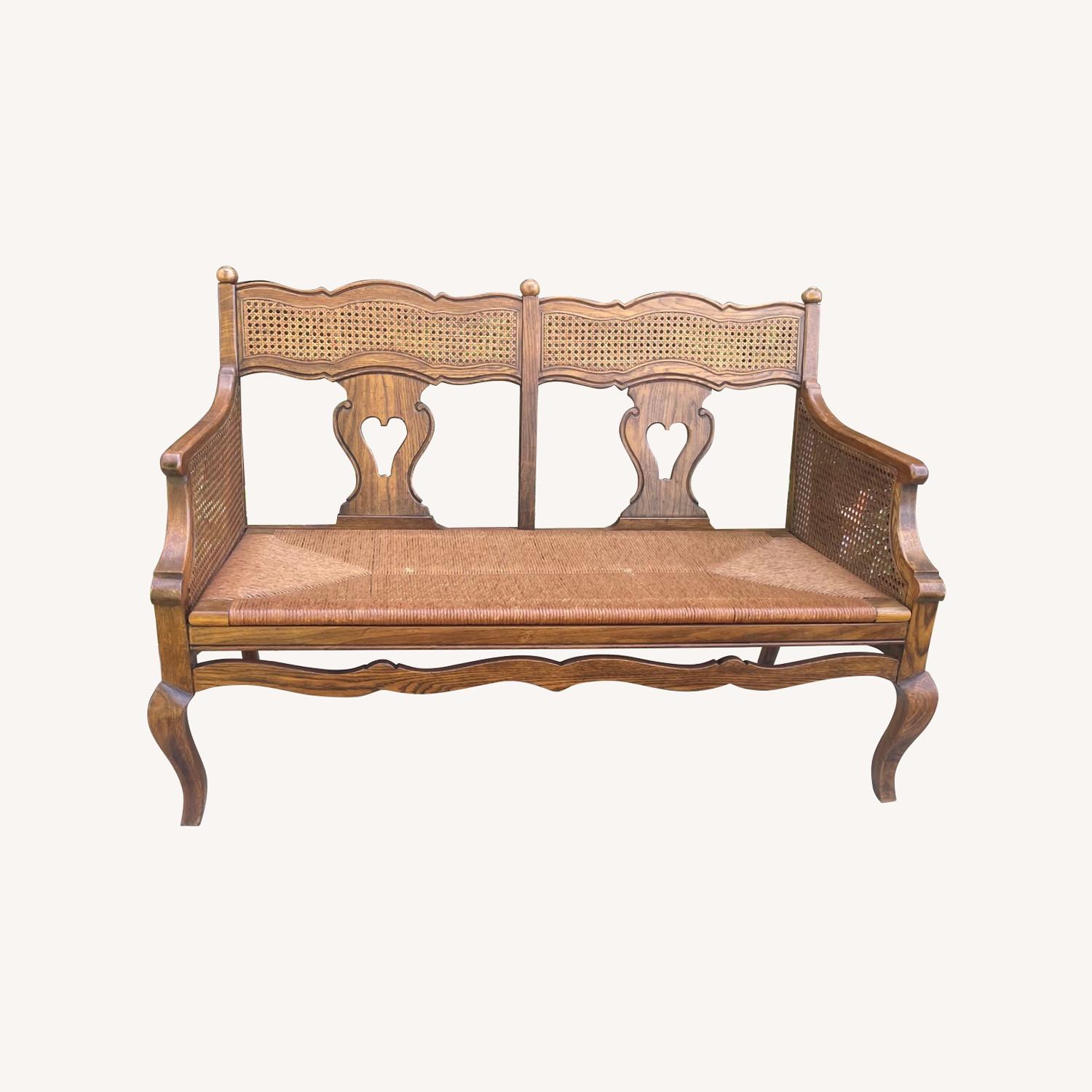 Seller's Notes:Vintage French Provincial Cane Settee with Rush Seat – 1970s Bring timeless French charm into your home with this elegant vintage cane bench. Crafted in the French Provincial style, this piece features: • Double cane backrest with gently scalloped top rails • Heart-shaped cut-outs for a touch of romantic detail • Rush-woven seat in excellent vintage condition • Cane side panels that add texture and airy appeal • Cabriole legs and serpentine stretcher showcasing graceful craftsmanship This bench is the perfect blend of form and function—ideal as an entryway seat, accent in a sunroom, or a stylish addition at the foot of a bed. Its warm wood finish pairs beautifully with farmhouse, French country, or shabby chic interiors. Dimensions (approx.): Width: 48 in Depth: 22 in Height: 36 in Seat Height: 18 in Condition: Very good vintage condition with light wear consistent with age. Cane is intact and sturdy, rush seat shows only minimal signs of use. Solid and ready for everyday enjoyment. This settee was likely produced in the 1960s–1980s by an American maker such as Tell City Chair Co., Ethan Allen, or Pennsylvania House, known for their quality French Provincial lines. ✨ A truly versatile piece that will add character, warmth, and French elegance to any space.