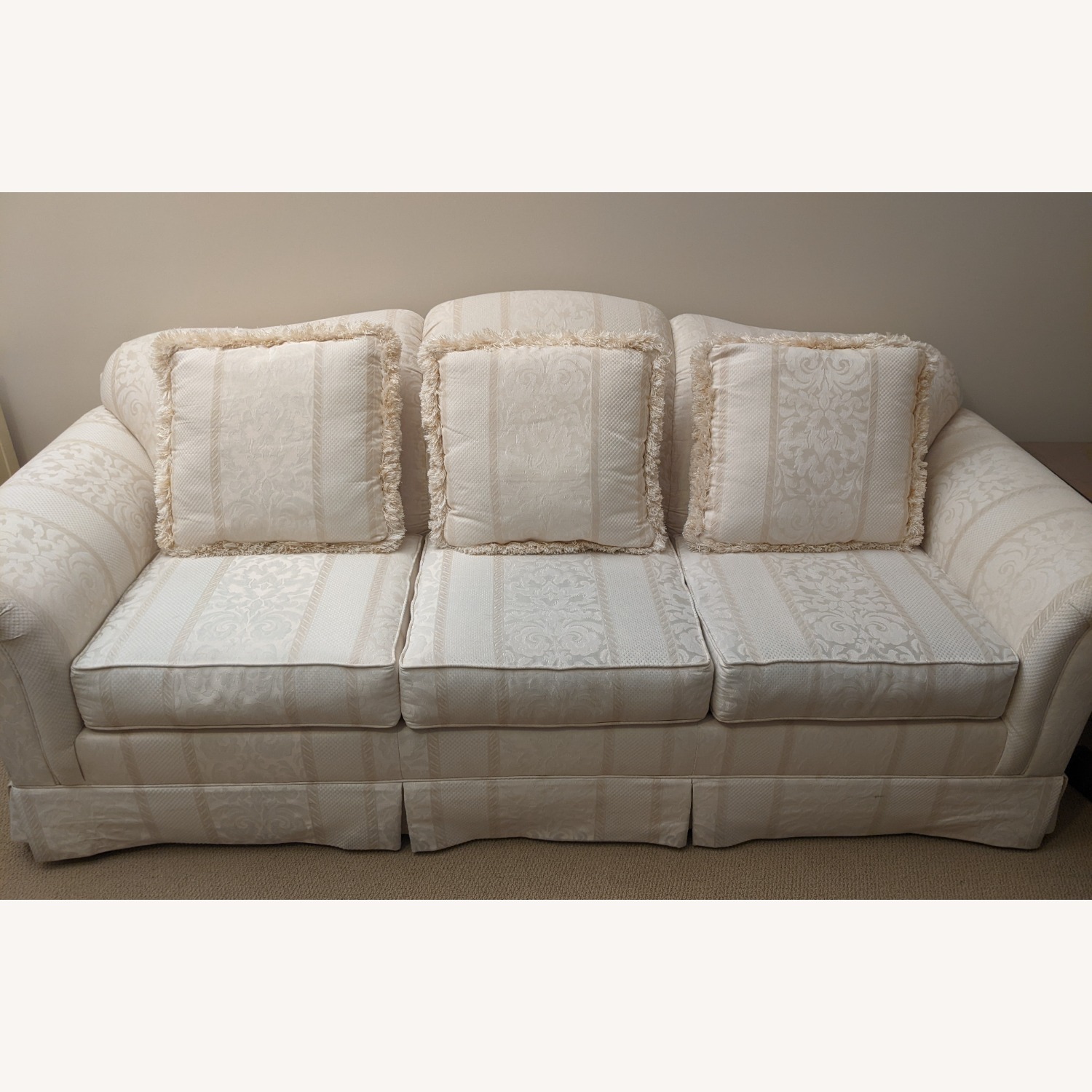 Seller's Notes:Vintage/Antique Cream-Colored 3+ seat Sleeper Sofa with 3 pillows. Mattress is 60" wide, 70" long, and sofa is 90" when mattress is extended. Slight tear on inside right (circled in red). Minor marks on back (center, left, and right).