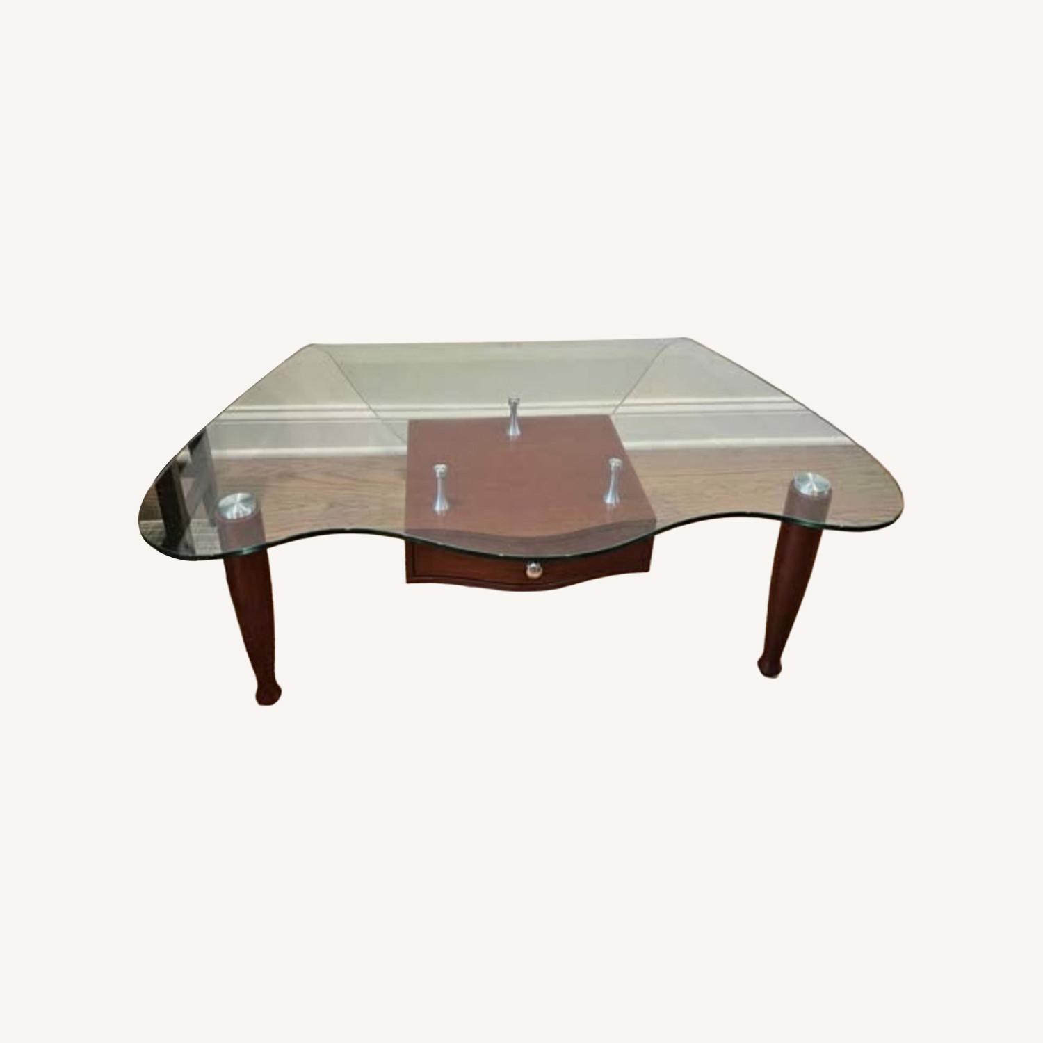 Seller's Notes: Elegant curved tempered glass top coffee table with rich mahogany wooden base. Features wavy edges, four turned legs, and a central square drawer with knob for storage. Good condition, stylish transitional design. Excellent condition A bit heavy for one person to lift Width is between 28-30 inches Depth is between 39-44 inches