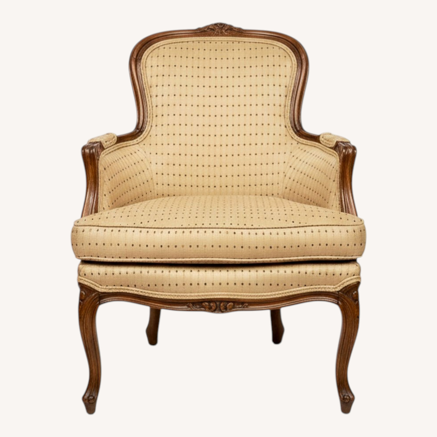 Seller's Notes:Vintage French Style Armchair – Carved Wood Accent Chair Description: Elegant vintage French-style armchair featuring a carved wood frame, cabriole legs, and classic tufted upholstery. This chair has beautiful proportions and a timeless look that works well in traditional, Parisian, or eclectic interiors. The frame is solid and sturdy with lovely wood grain and carved floral details. Upholstery is clean overall with light wear consistent with age. Comfortable and ready to use as a living room accent chair, bedroom chair, or reading chair. Condition: Good vintage condition • Structurally solid • Light wear consistent with age • Minor patina on wood Dimensions: 37” H × 27” W × 25” D