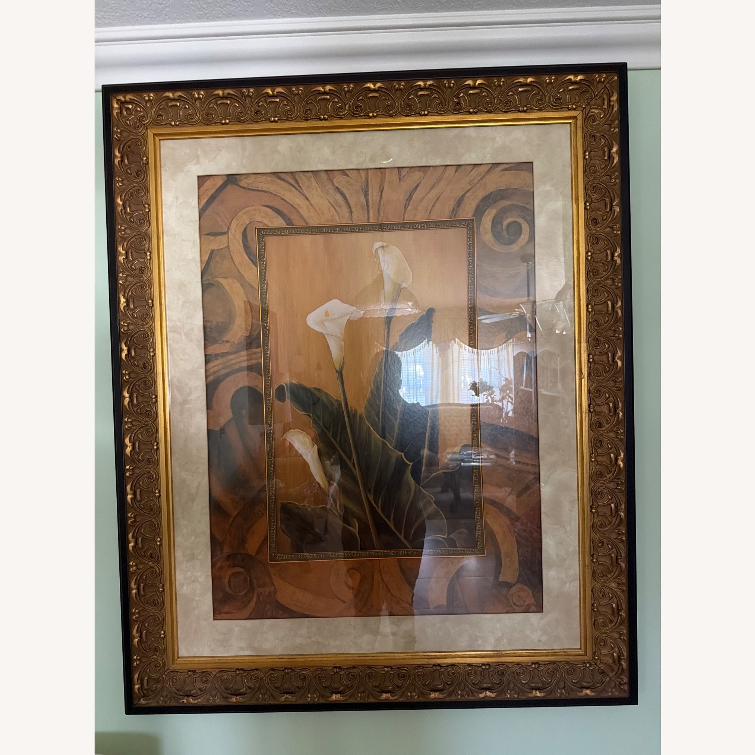 Seller's Notes:This is a decorative framed wall art print featuring a still life of calla lilies Style: The painting has a warm-toned, classical look with ornate gold-colored framing.